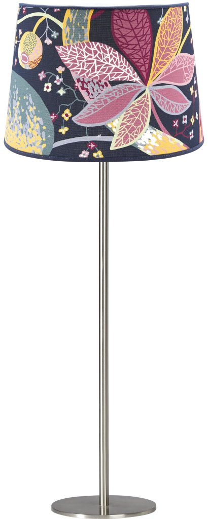 Ett pakett med 45 cm hög lampfot Base i kromfärgad metall med Frank marin lampskärm i bomullstyg.