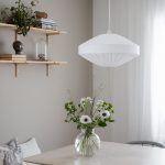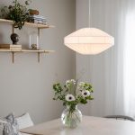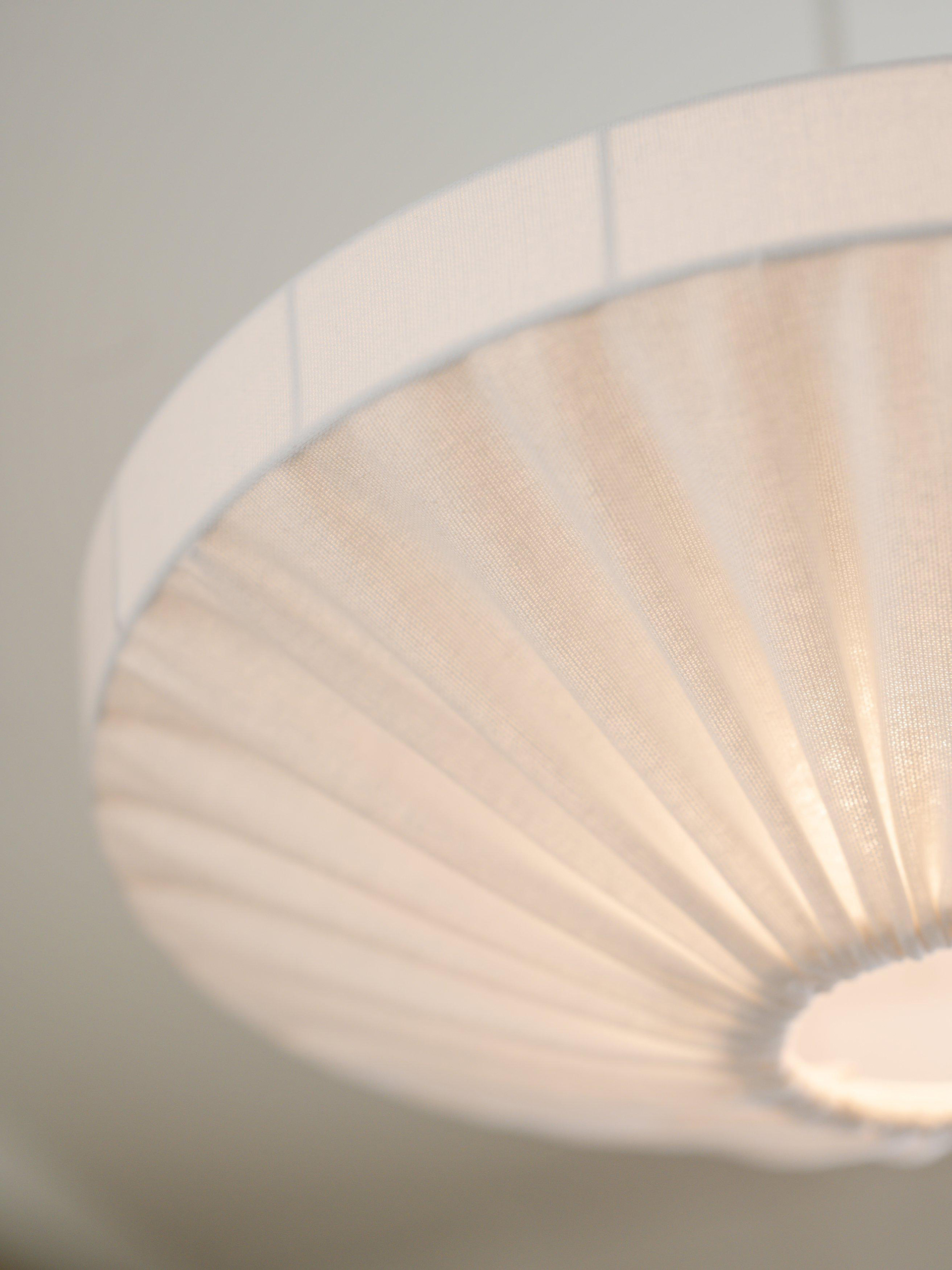Taklampa Edith är en modern skandinavisk ”ufo” modell i bomullstyget Franza, som ger ett mjukt och jämt sken. Skärmen är handgjord i EU av spilltyg från tillverkning av