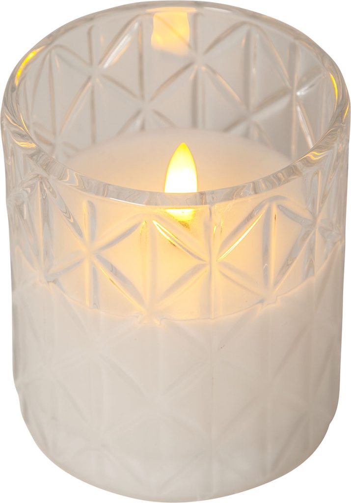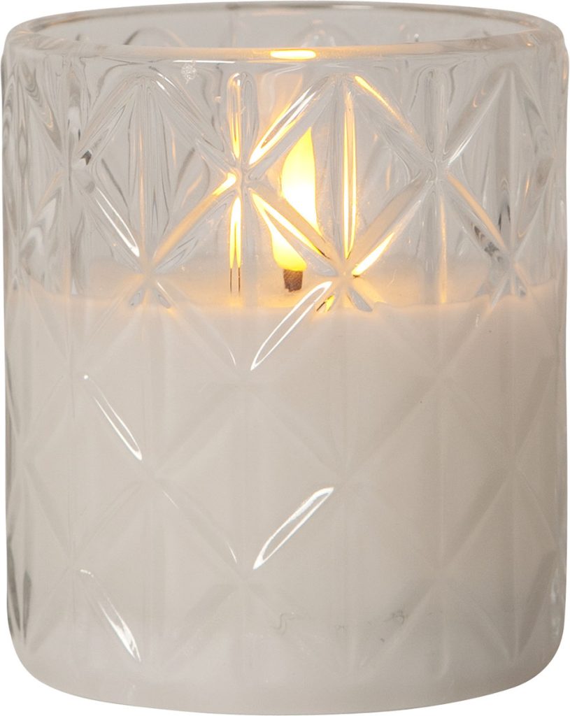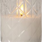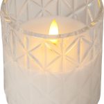 Flamme Romb är ett vaxljus i ett klart glashölje med rombformat mönster. Vacker realistisk LED-låga med varmvitt ljus.
