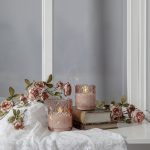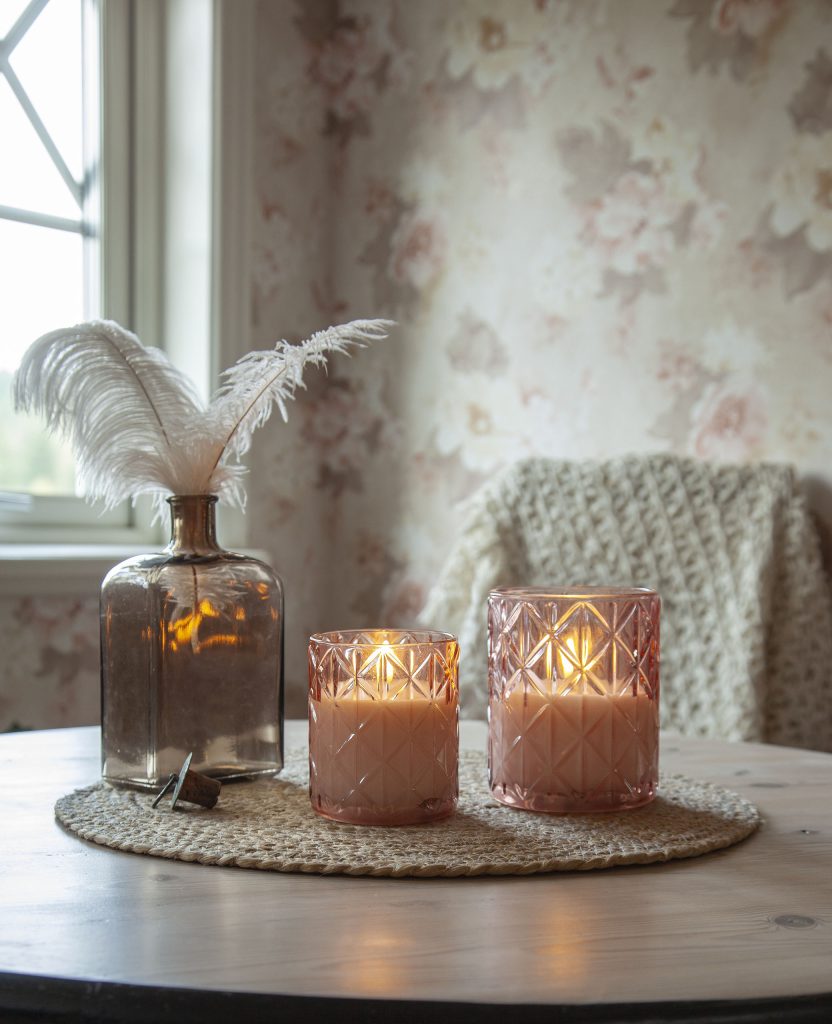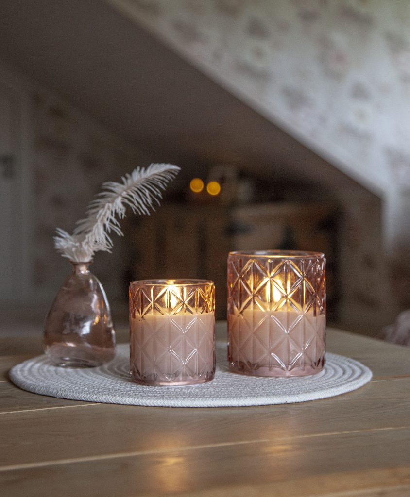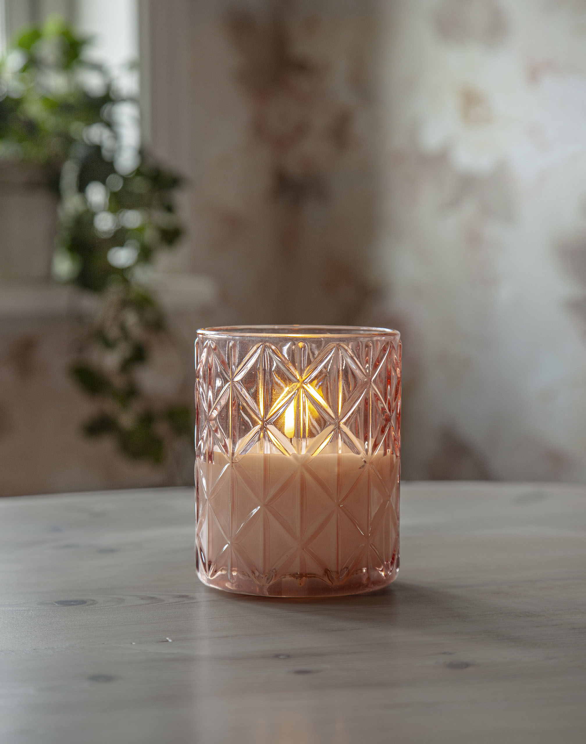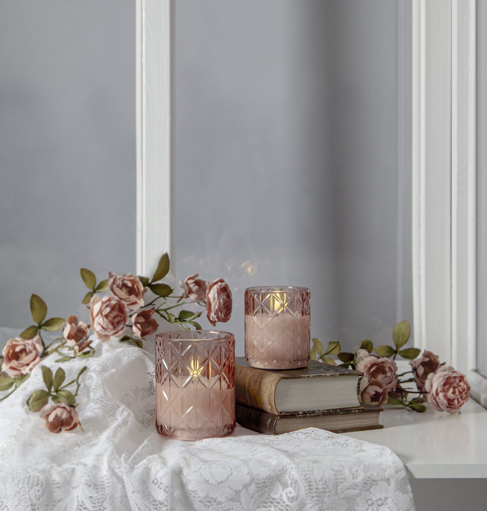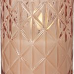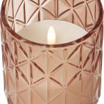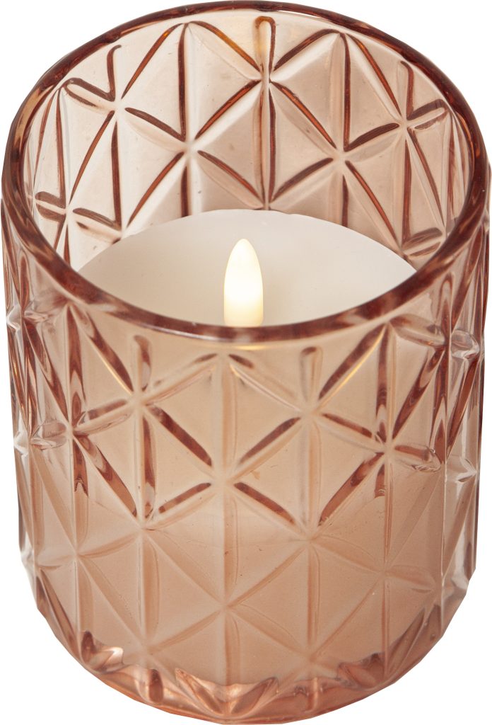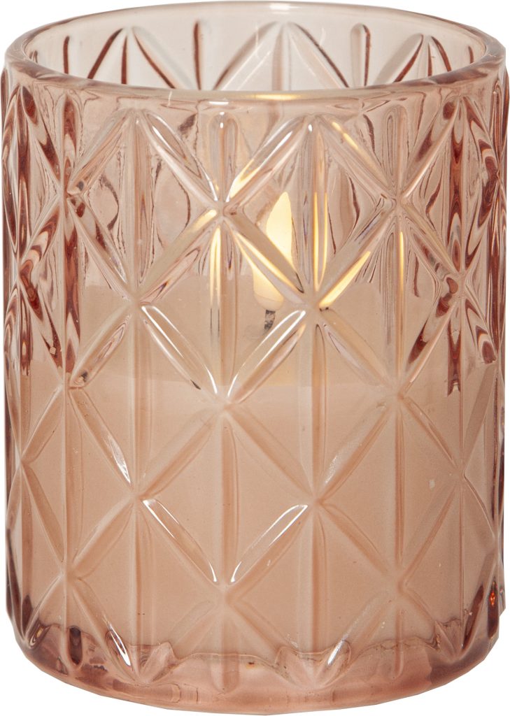 Vaxljus i ett rosafärgat glashölje med rombformat mönster. Vacker realistisk LED-låga med varmvitt ljus.