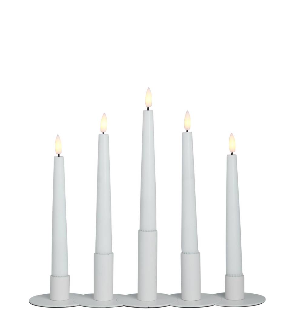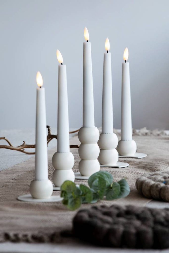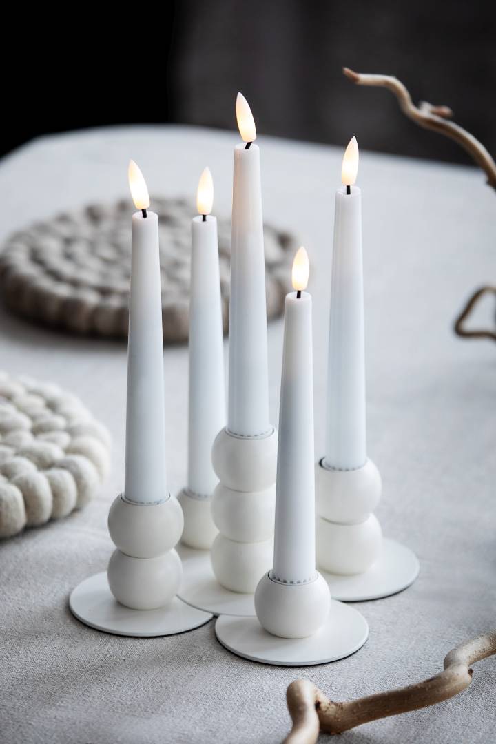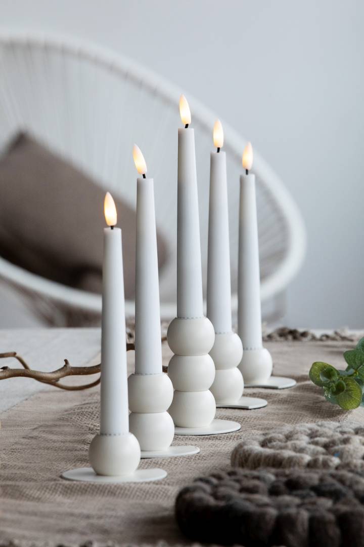 De vita metalljusstakarna med matt yta är vackra och passar i många interiörer och dukningar.