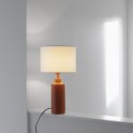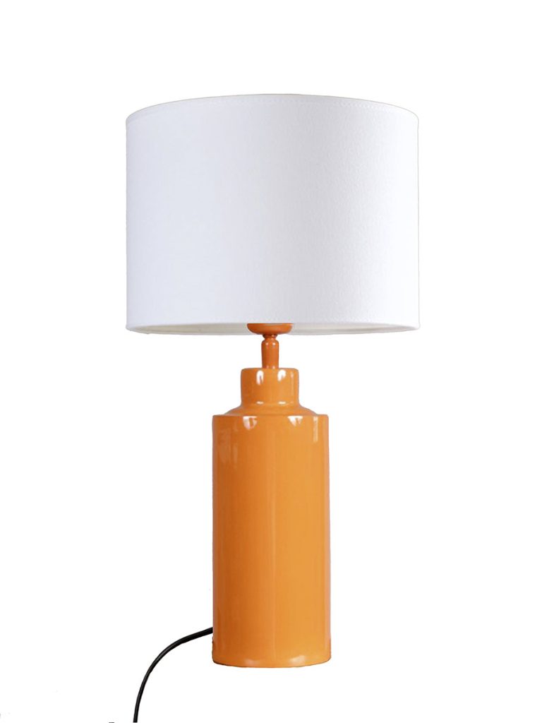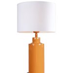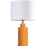 Ett pakett med 32 cm hög lampfot Solo i metall med högblank orange finish, och en cylinderformad lampskärm i vit bomull.