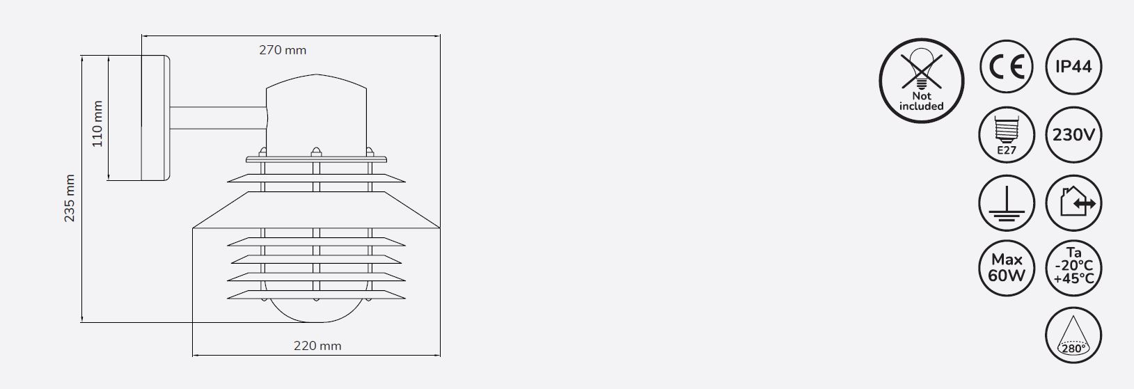 IP44. E27, max 60W. Ljuskälla ingår ej.