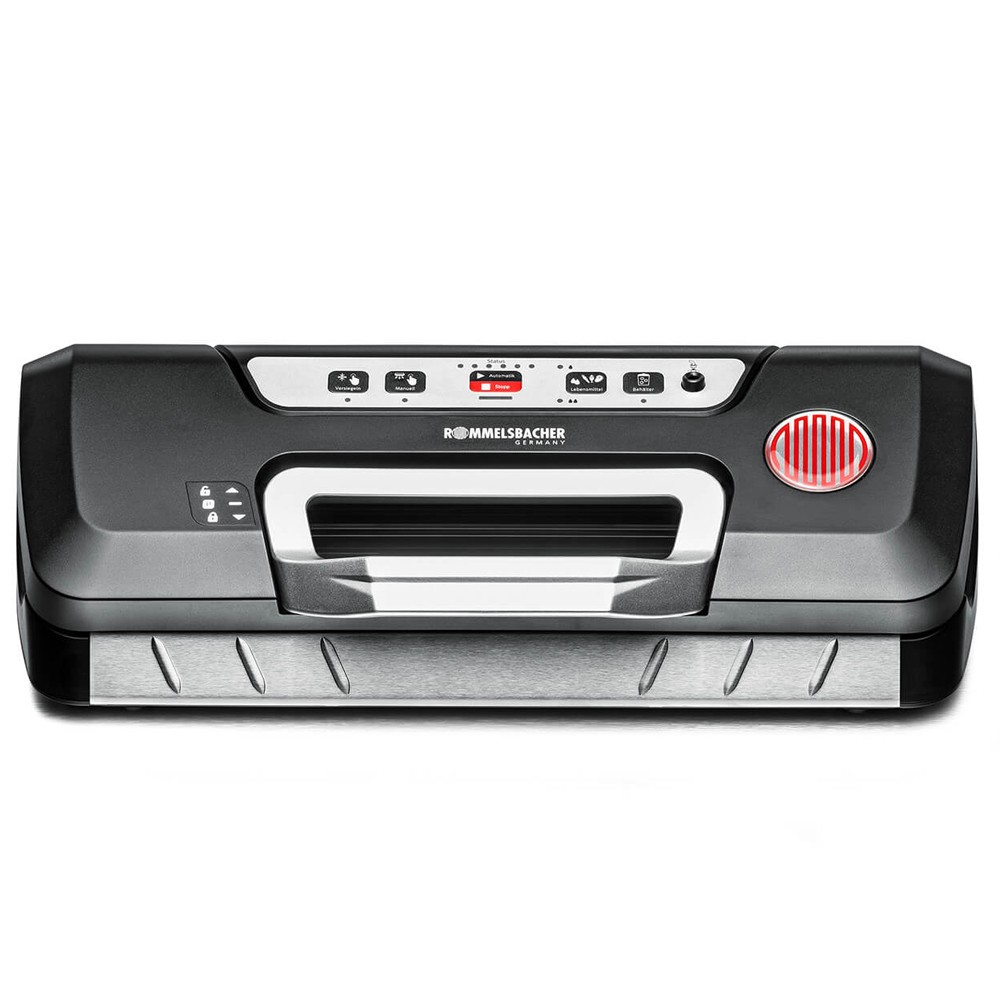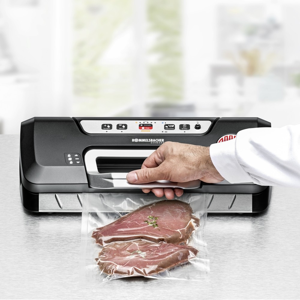 Rommelsbacher VAC 285 är en högkvalitativ vakuumförpackare. Det stora handtaget möjliggör bekväm enhandsanvändning – apparaten kan enkelt öppnas och stängas säkert. Den effektiva pumpen suger upp till 97 % av luften från vakuumpåsarna och förseglar påsarna sedan helt automatiskt med en tät söm i endast ett arbetssteg. Med två justerbara vakuumförpackningstider kan proceduren anpassas individuellt till mat som ska bearbetas. För särskilt tryckkänslig mat finns en manuell vakuumförpackning och förseglingsfunktion tillgänglig. Det upplysta kontrollfönstret är särskilt praktiskt eftersom man lätt kan kontrollera att påsen ligger rätt.