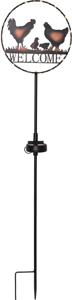 Solcellspinnen Welcome är en trädgårdsdekoration med utskuret motiv av hönor och texten Welcome. Den blir en vacker dekoration och är lättplacerad både i en gång eller i en kruka vid entrén. De 15 ljuspunkterna lyser upp med varmvitt sken under natten.