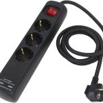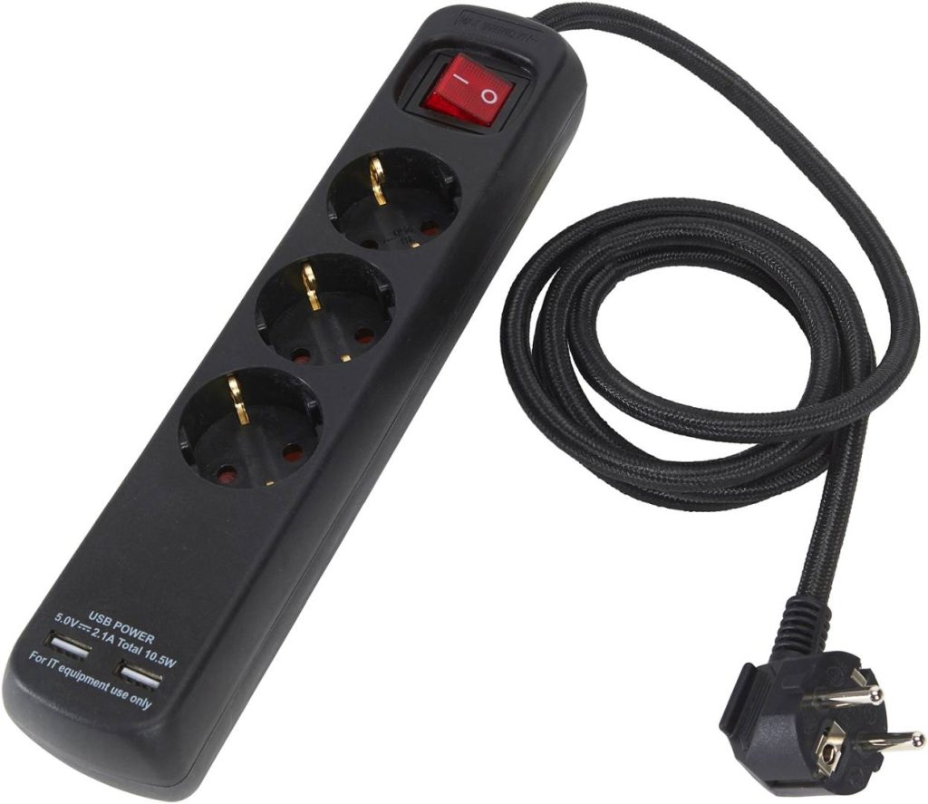 3-osainen jatkojohto kahdella USB-portilla ja ON/OFF-katkaisijalla.