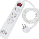 3-osainen jatkojohto kahdella USB-portilla ja ON/OFF-katkaisijalla.