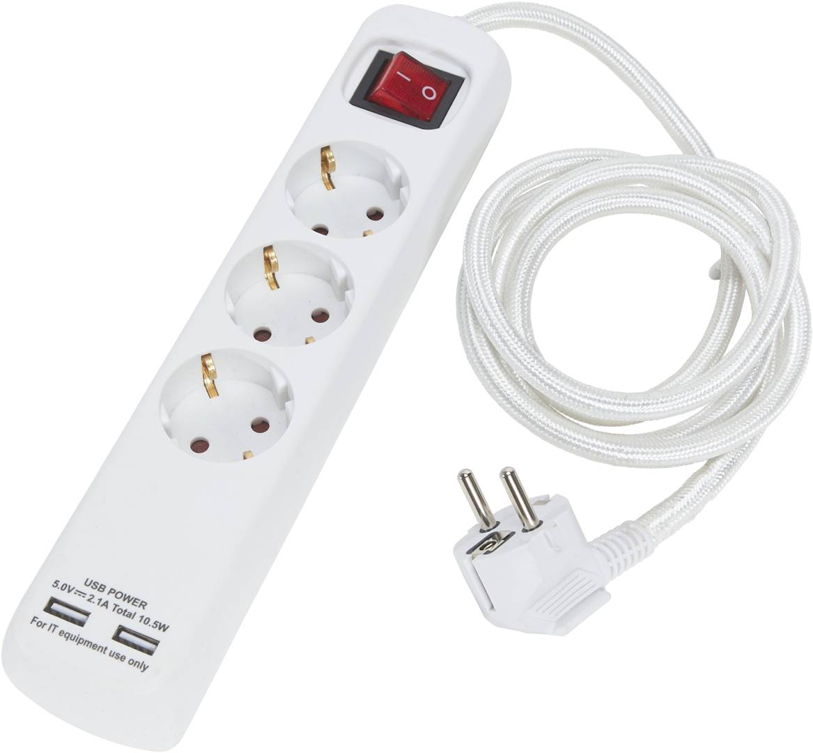 Jatkojohto 3-osainen + USB valkoinen 1,4 m