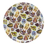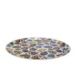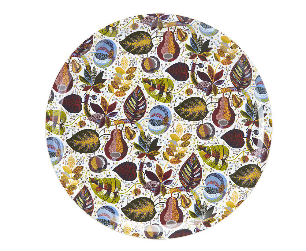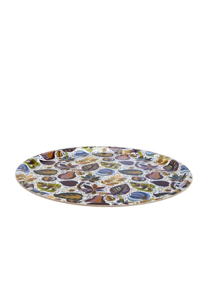 Pyöreä laminoitu tarjotin Adam & Eva -kuvioinnilla.