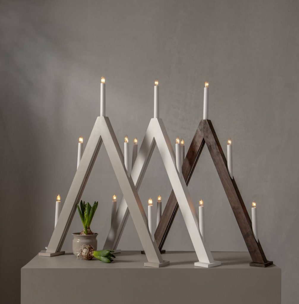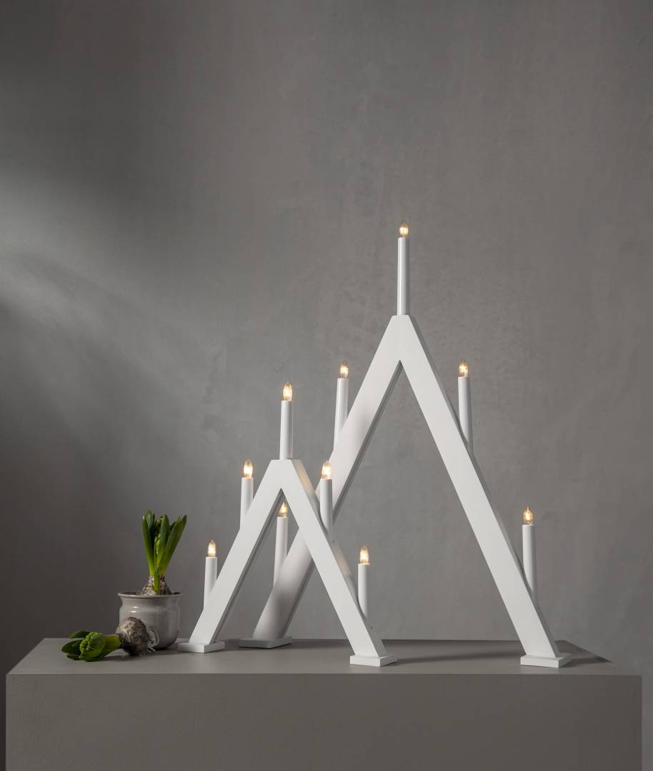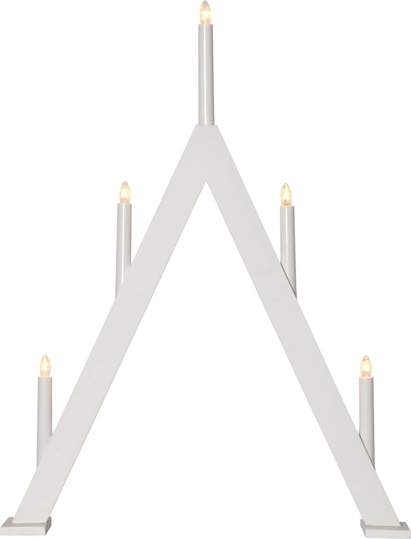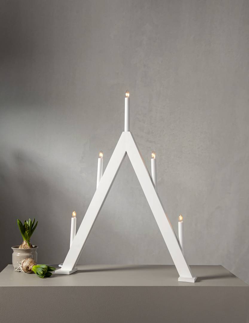 Elegantti valkoiseksi maalattu 5-haarainen puukynttelikkö. Sopii esimerkiksi ikkunalaudalle tuomaan kotiin ihanaa joulutunnelmaa.