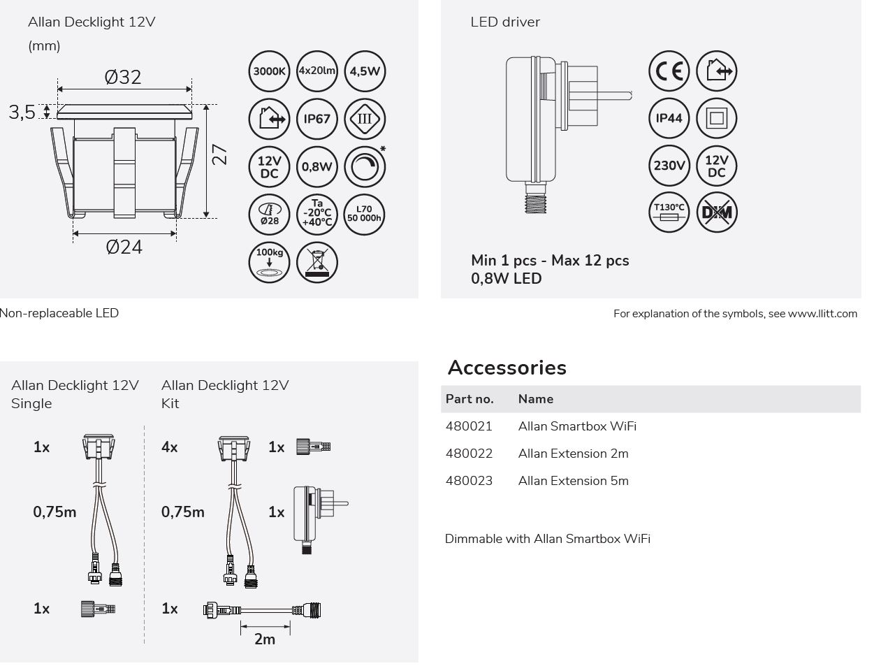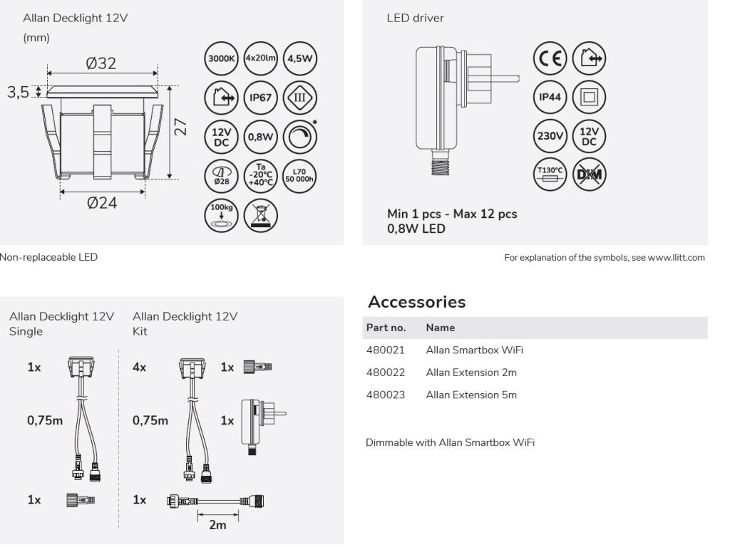 Sisältää 4 valaisinta ja muuntajan. Lisätarvikkeena saatavana myös lisäosa 1-pack (EE-480018), Smartbox (EE-480021), jatkojohto 2 m (EE-480022) ja jatkojohto 5 m (EE-480023).
