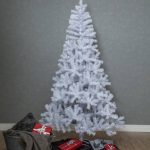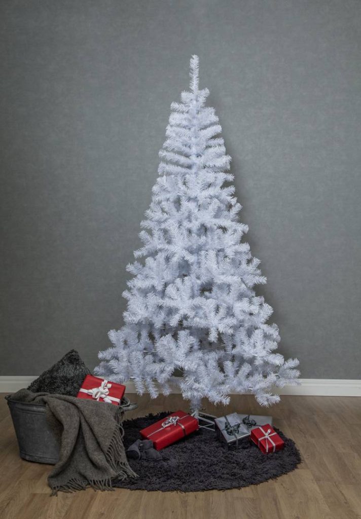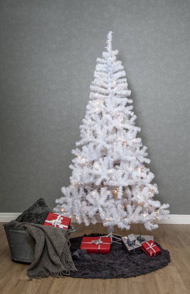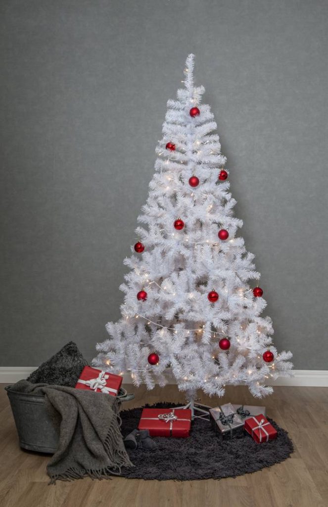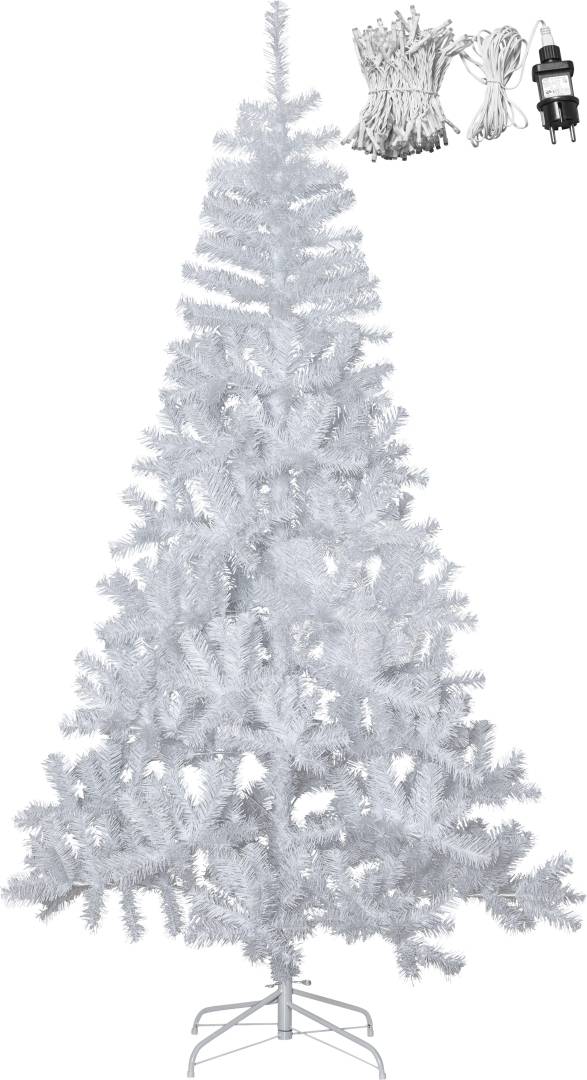 Valkoinen joulukuusi, joka sopii sekä ulko- että sisäkäyttöön. Mukana 180-osainen LED-valosarja valkoisilla valoilla.