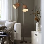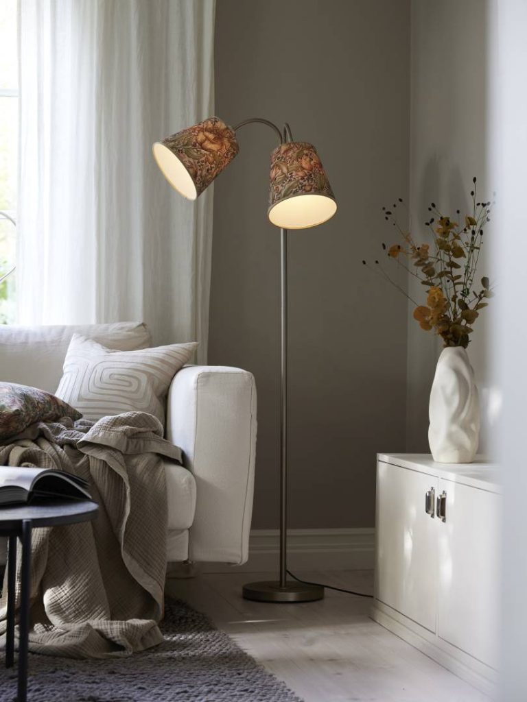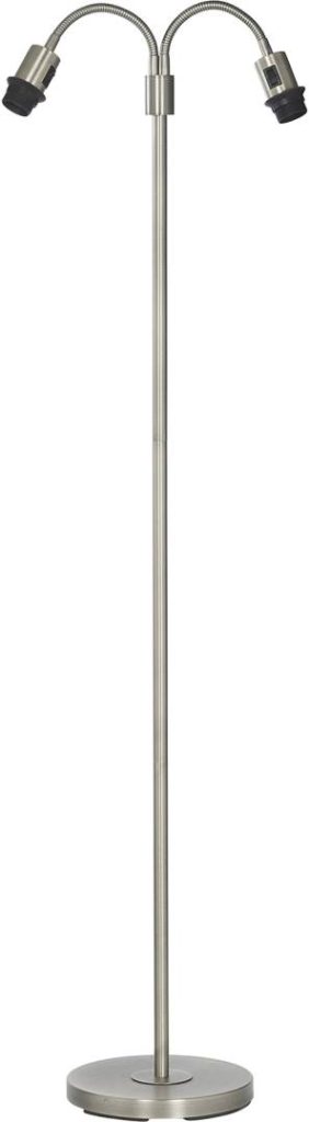 Kaksiosainen lattiavalaisin metallia. Valaisimen yläosassa on joustavat varret. Valaisimeen sopii varjostimet, joissa on E27-ylälaippakiinnitys.