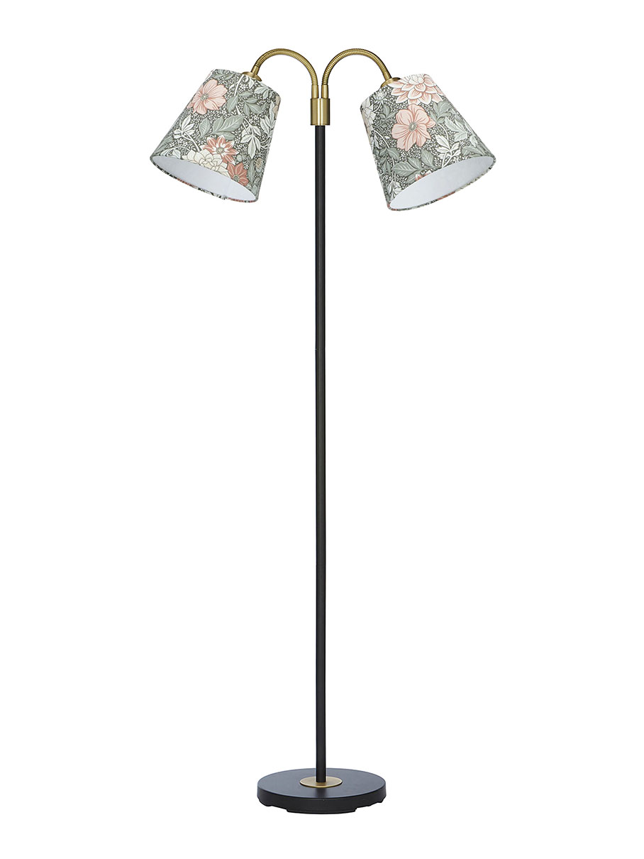 Lattiavalaisinpaketti, jossa on 150 cm korkea musta Amy Flex2 -lattiavalaisin ja kaksi Cia Dahlia-lampunvarjostinta vihreän ja vaalean roosan värisenä. Varjostin on luotu PR Homen ja Boråstapeterin yhteistyönä. Dahlia Garden -kangas on 100% kierrätettyä polyesteria, kuvio on digitaalisesti painettu, ja värit tulevat kuosista kauniisti esiin. Kangas on painettu Boråsissa, Ruotsissa. Kuvion on käsin maalannut suunnittelija Jenny Hahne Gadd Boråstapeterille.