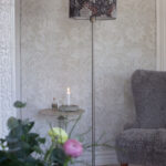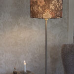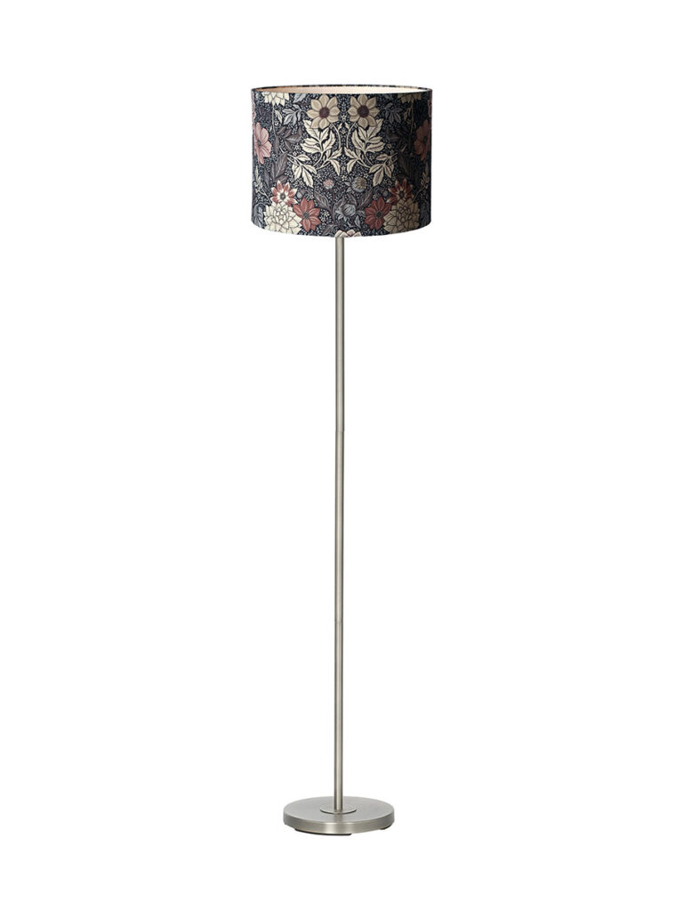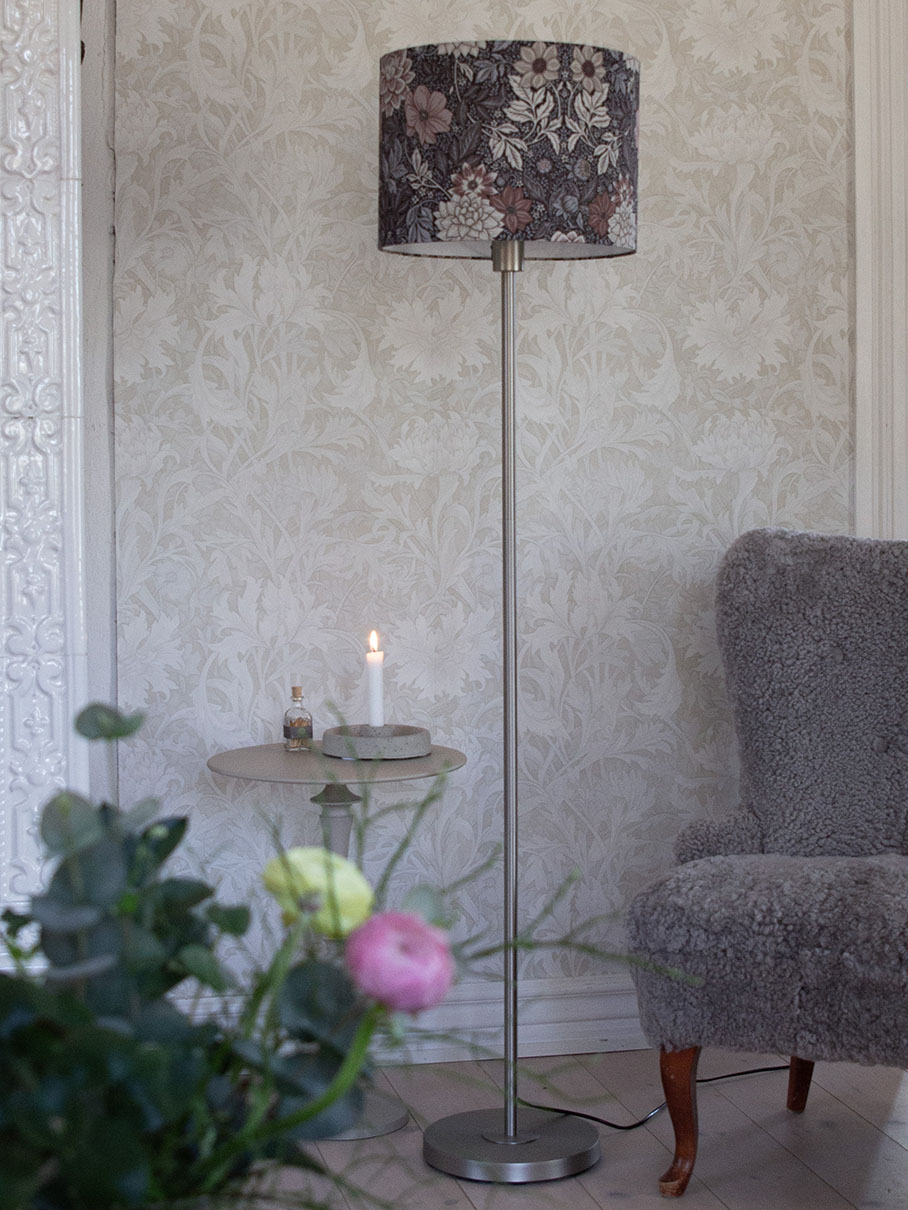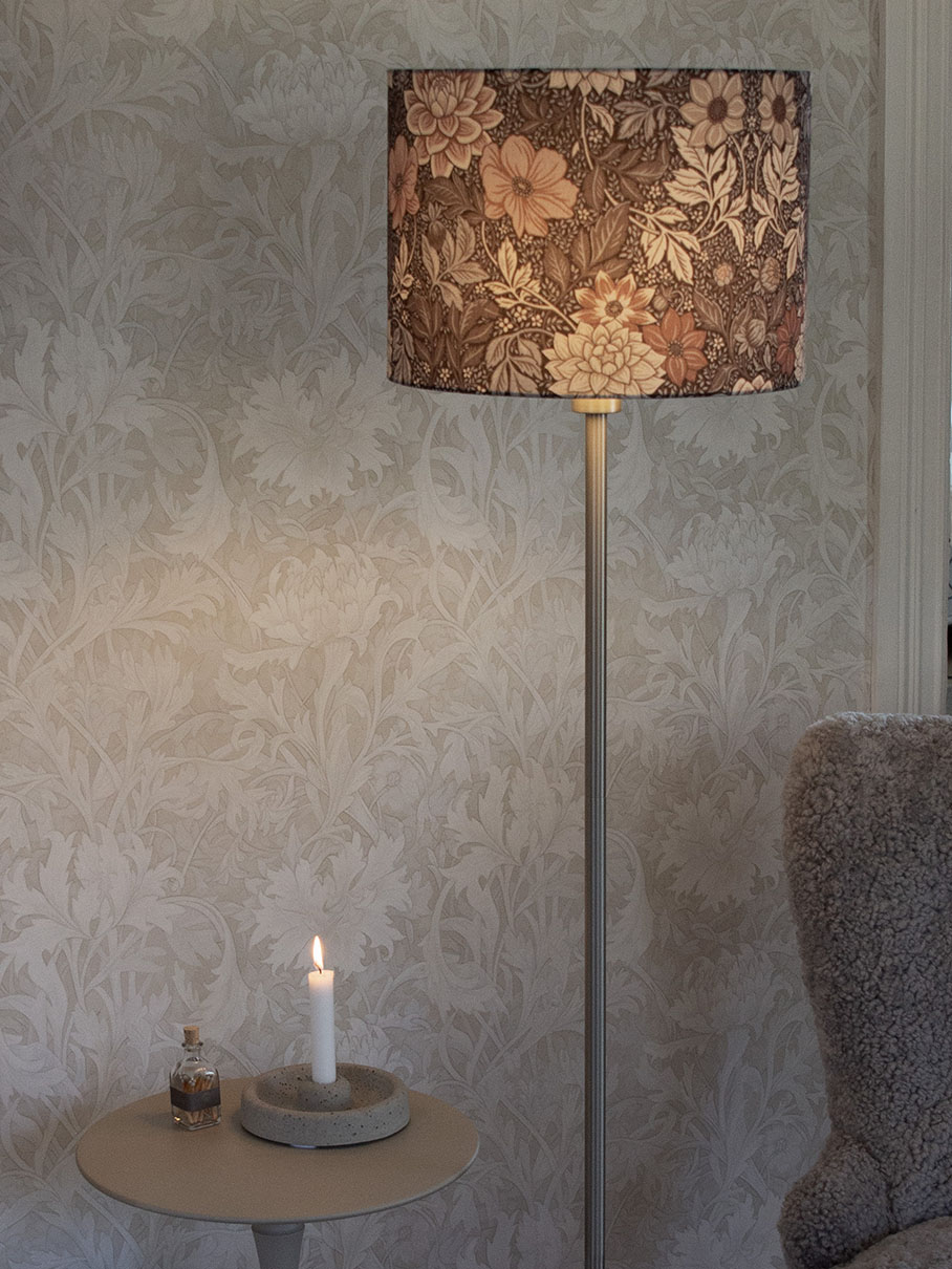 Lattiavalaisinpaketti, jossa on 130 cm korkea jalka ja Sara Dahlia-lampunvarjostin ruskean ja puuteriroosan värisenä. Varjostin on luotu PR Homen ja Boråstapeterin yhteistyönä. Dahlia Garden -kangas on 100% kierrätettyä polyesteria, kuvio on digitaalisesti painettu, ja värit tulevat kuosista kauniisti esiin. Kangas on painettu Boråsissa, Ruotsissa. Kuvion on käsin maalannut suunnittelija Jenny Hahne Gadd Boråstapeterille.