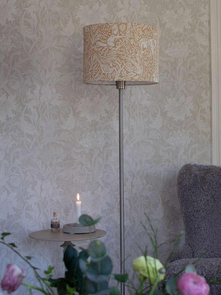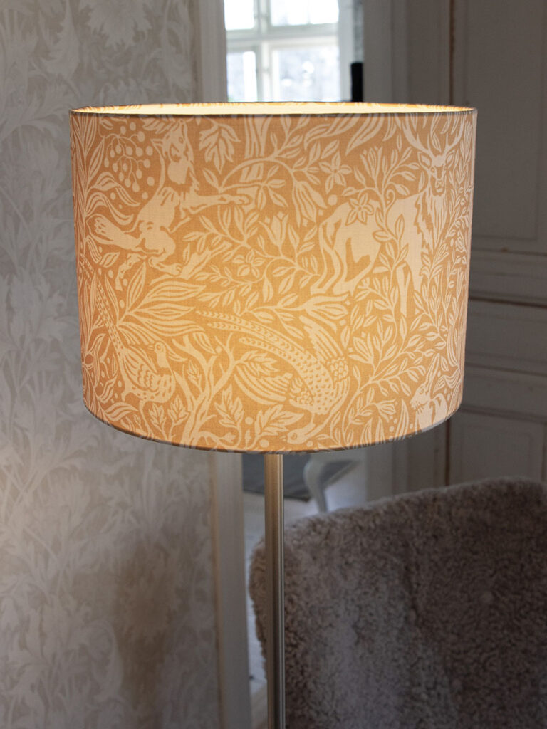 Lattiavalaisinpaketti, jossa on 130 cm korkea jalka ja Sara Under the Elder Tree -varjostin tumman leijonankeltaisen värisenä. Varjostin on luotu PR Homen ja Boråstapeterin yhteistyönä. Under the Elder Tree -kangas on 100% kierrätettyä polyesteria, kuvio on digitaalisesti painettu, ja värit tulevat kuosista kauniisti esiin. Kangas on painettu Boråsissa, Ruotsissa. Kankaan tiheä lehvästö luo kauniin yhtenäisen kuvion ja lähempää tarkasteltuna metsän valtakunnasta paljastuu kauniita yksityiskohtia.