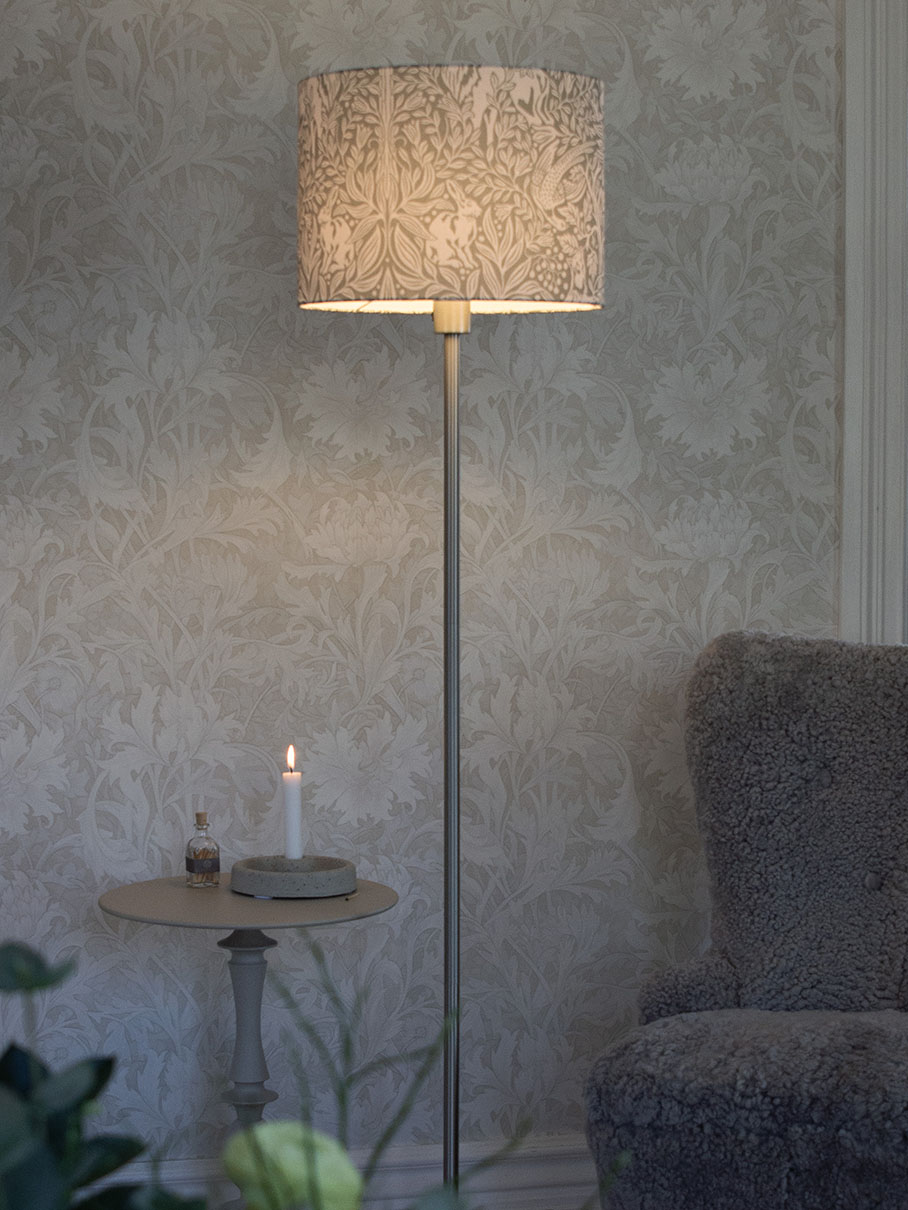 Lattiavalaisinpaketti, jossa on 130 cm korkea jalka ja Sara Under the Elder Tree -varjostin rauhallisen harmaanvihertävän värisenä. Varjostin on luotu PR Homen ja Boråstapeterin yhteistyönä. Under the Elder Tree -kangas on 100% kierrätettyä polyesteria, kuvio on digitaalisesti painettu, ja värit tulevat kuosista kauniisti esiin. Kangas on painettu Boråsissa, Ruotsissa. Kankaan tiheä lehvästö luo kauniin yhtenäisen kuvion ja lähempää tarkasteltuna metsän valtakunnasta paljastuu kauniita yksityiskohtia.