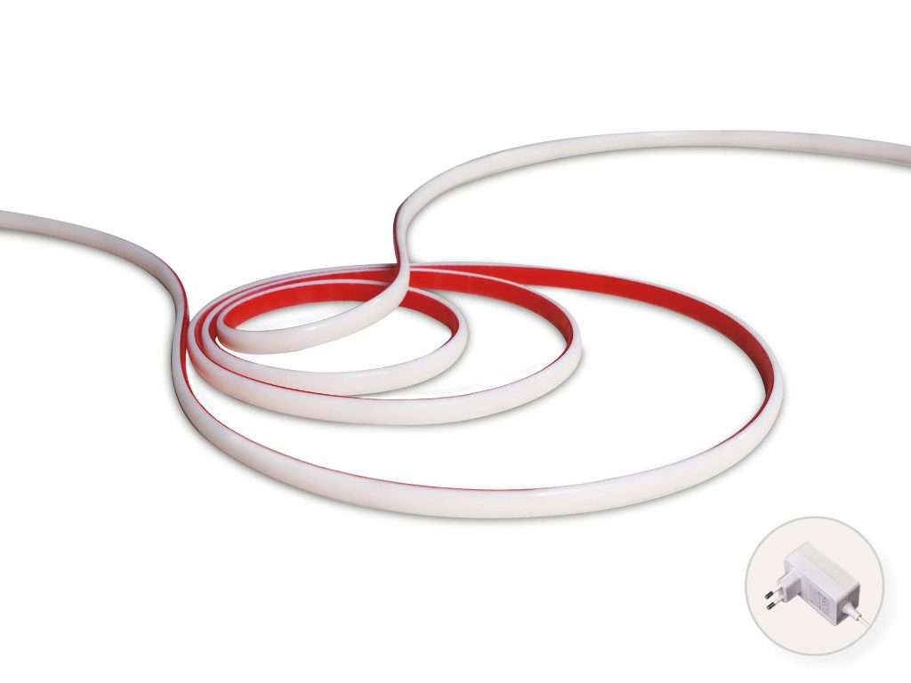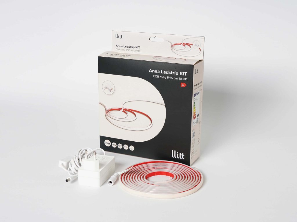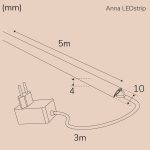 Pakkaus sisältää plug-in -muuntajan 3 metrin johdolla, jossa on katkaisija. LED-nauhan pituus on 5 metriä, ja se on leikattavissa merkityistä kohdista. Huomioi, että mikäli nauhaa leikataan, se ei ole enää IP65-luokiteltu.