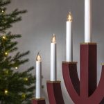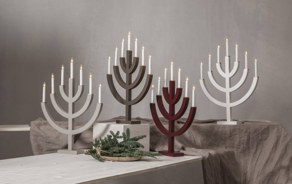 Moderni, mutta samalla perinteinen puukynttelikkö kullanvärisiksi maalatuilla puisilla koristeilla. Kynttelikkö sopii täydellisesti ikkunalaudalle tai lipaston päälle.