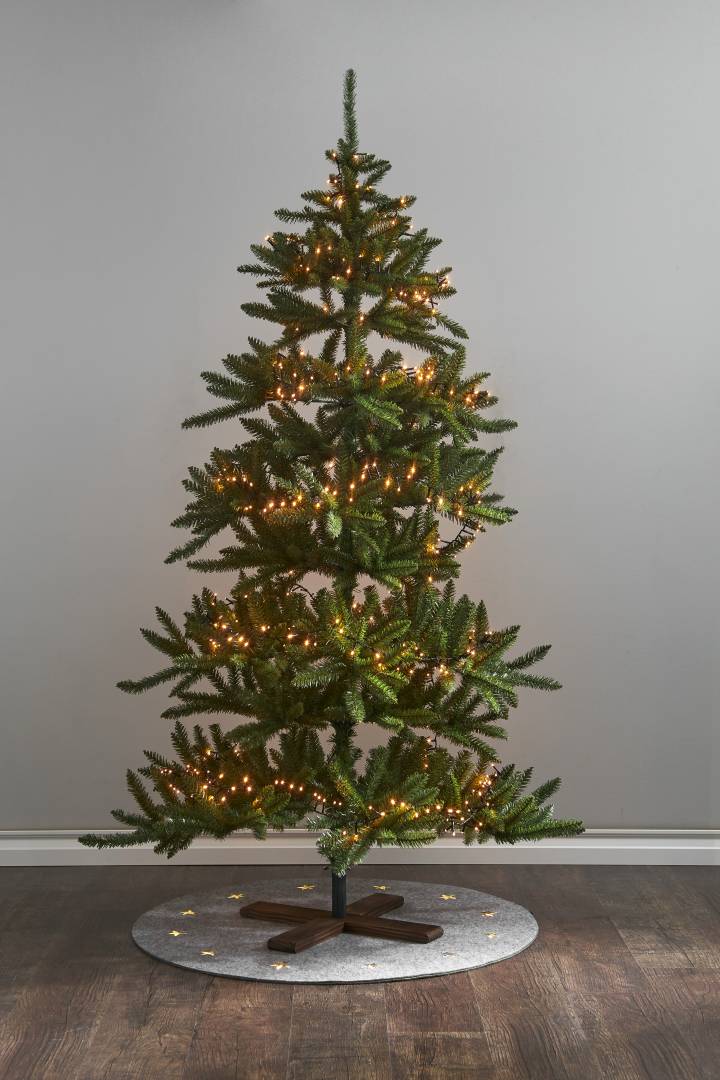 Sisäkäyttöön sopiva vihreä joulukuusi tummanruskealla puujalustalla.
