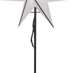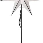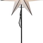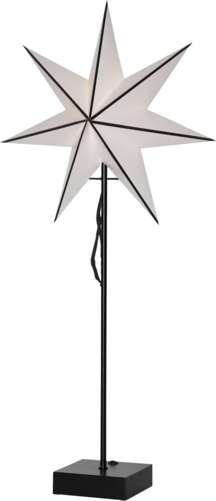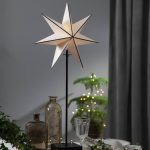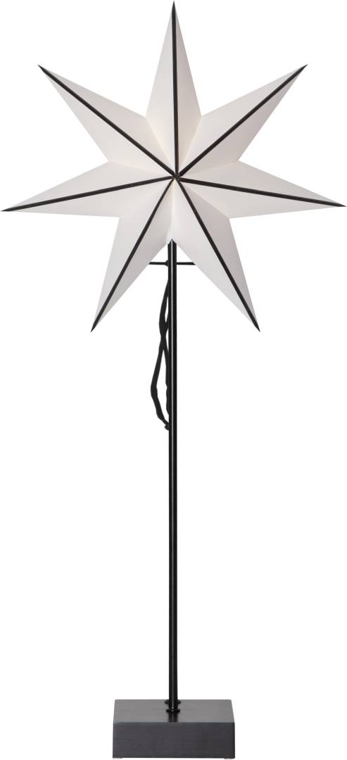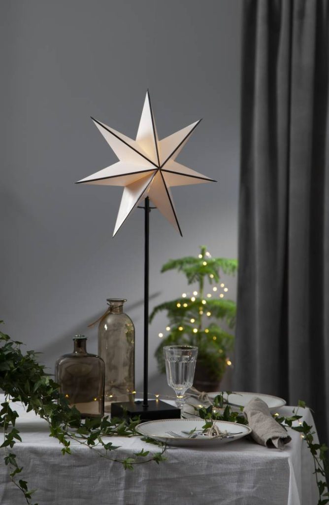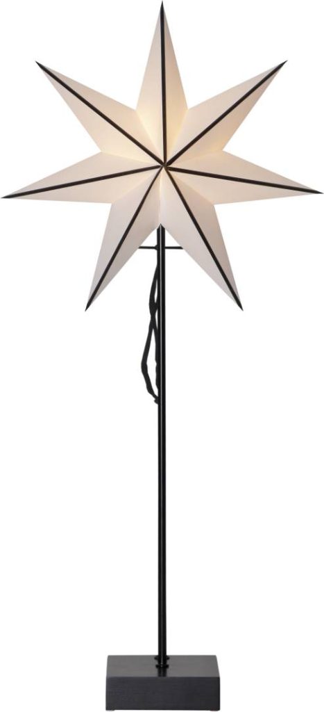 Paristokäyttöinen pöytätähti, jossa on jalusta mustaa puuta ja metallia ja tähti koristeraidoitettua valkoista paperia.