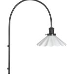 August-seinävalaisimessa on kaareva musta metallirunko ja opaalivalkoinen vekattu lasivarjostin.