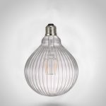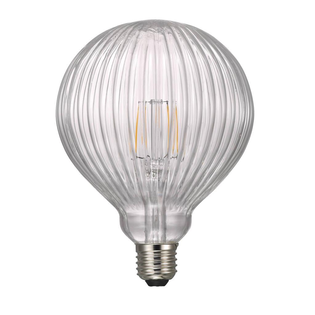 Koristeellinen LED-filamenttilamppu kirkkaalla uritetulla lasikuvulla.