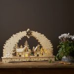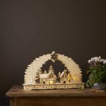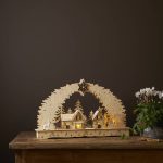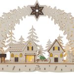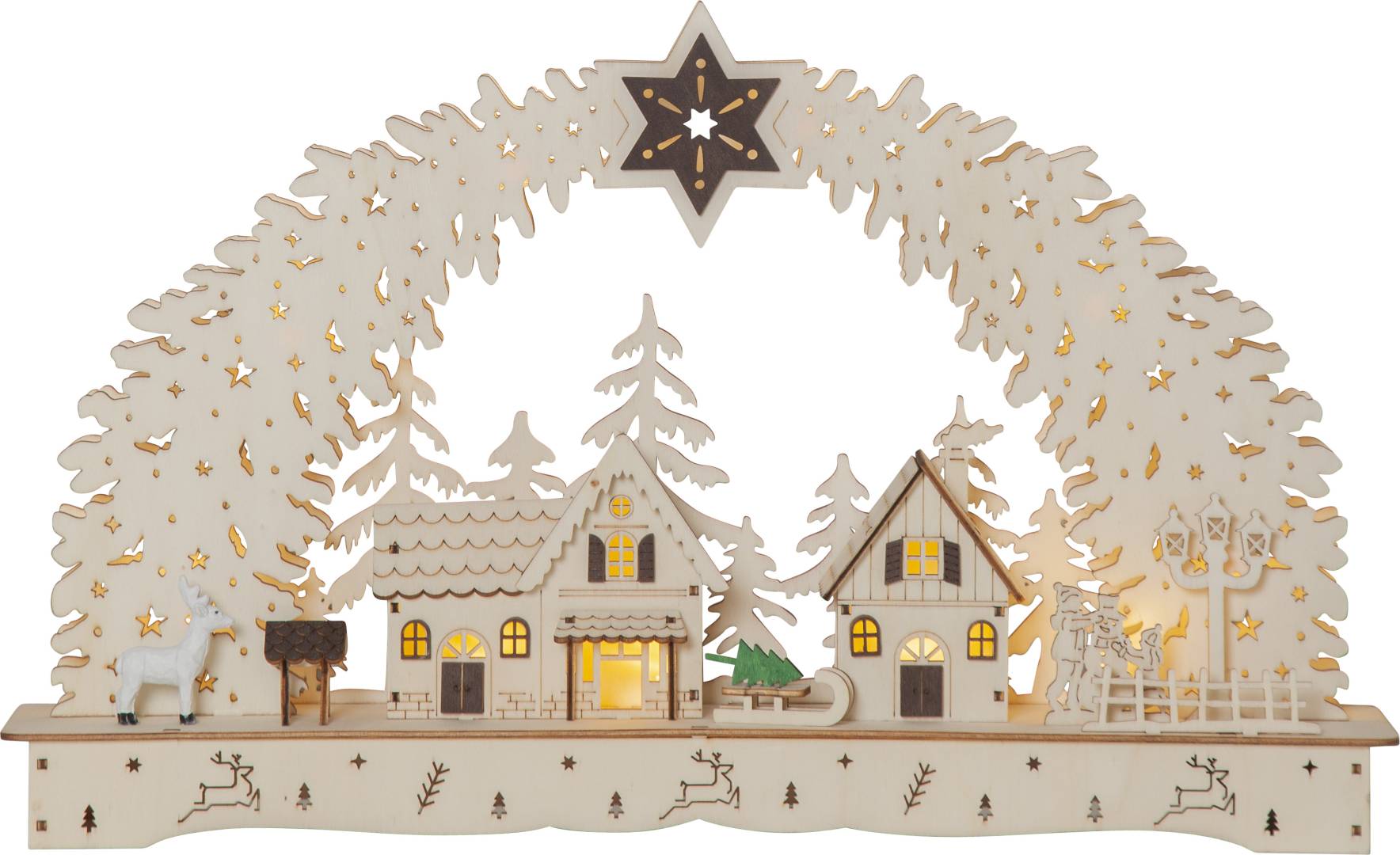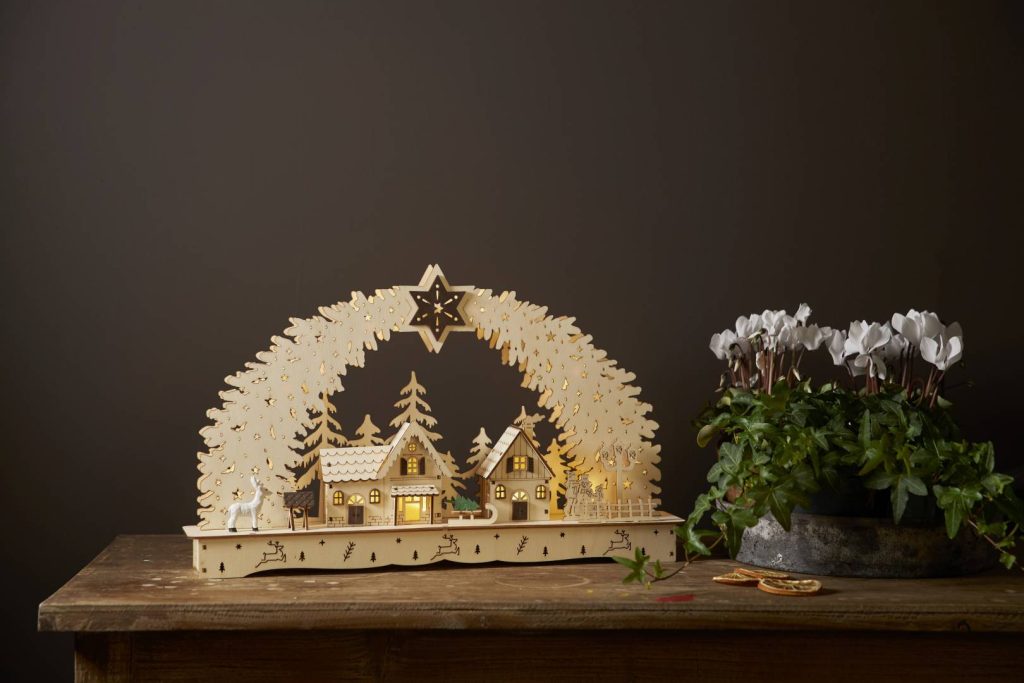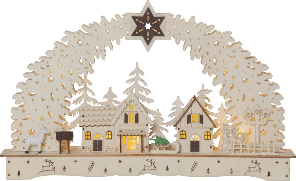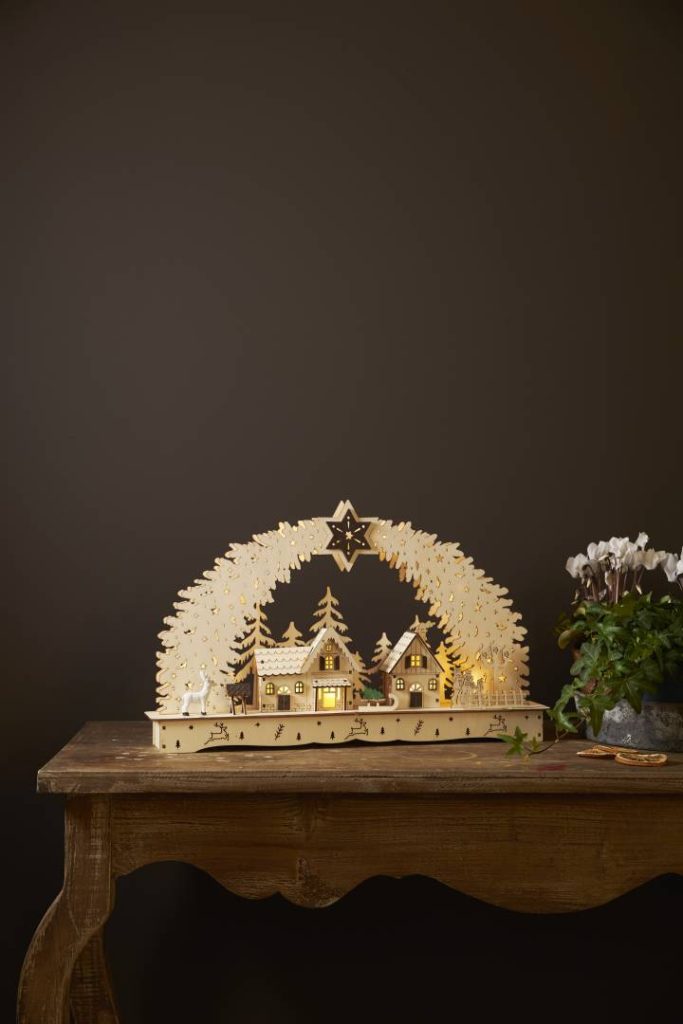 Laserleikattu puinen kynttelikkö, jossa on runsaasti yksityiskohtia. Koristetta valaisee 10 pientä LED-lamppua lämpimän valkoisella valolla. Sisäkäyttöön.