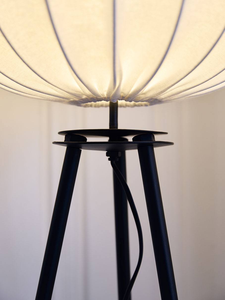 Kolmijalkaiseen Base lattiavalaisimen jalka, johon on yhdistetty puuvillainen Hilma-varjostin. Valaisin luo pehmeän ja tunnelmallisen valaistuksen esimerkiksi olohuoneeseen.