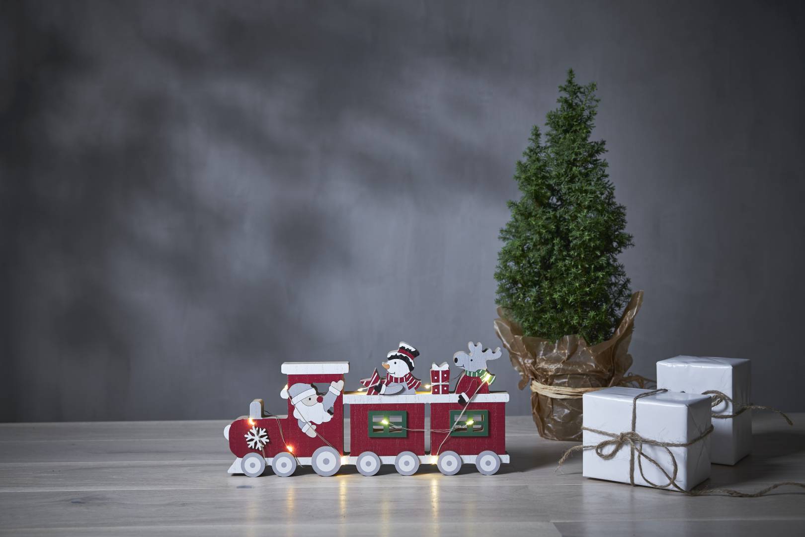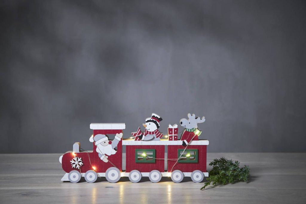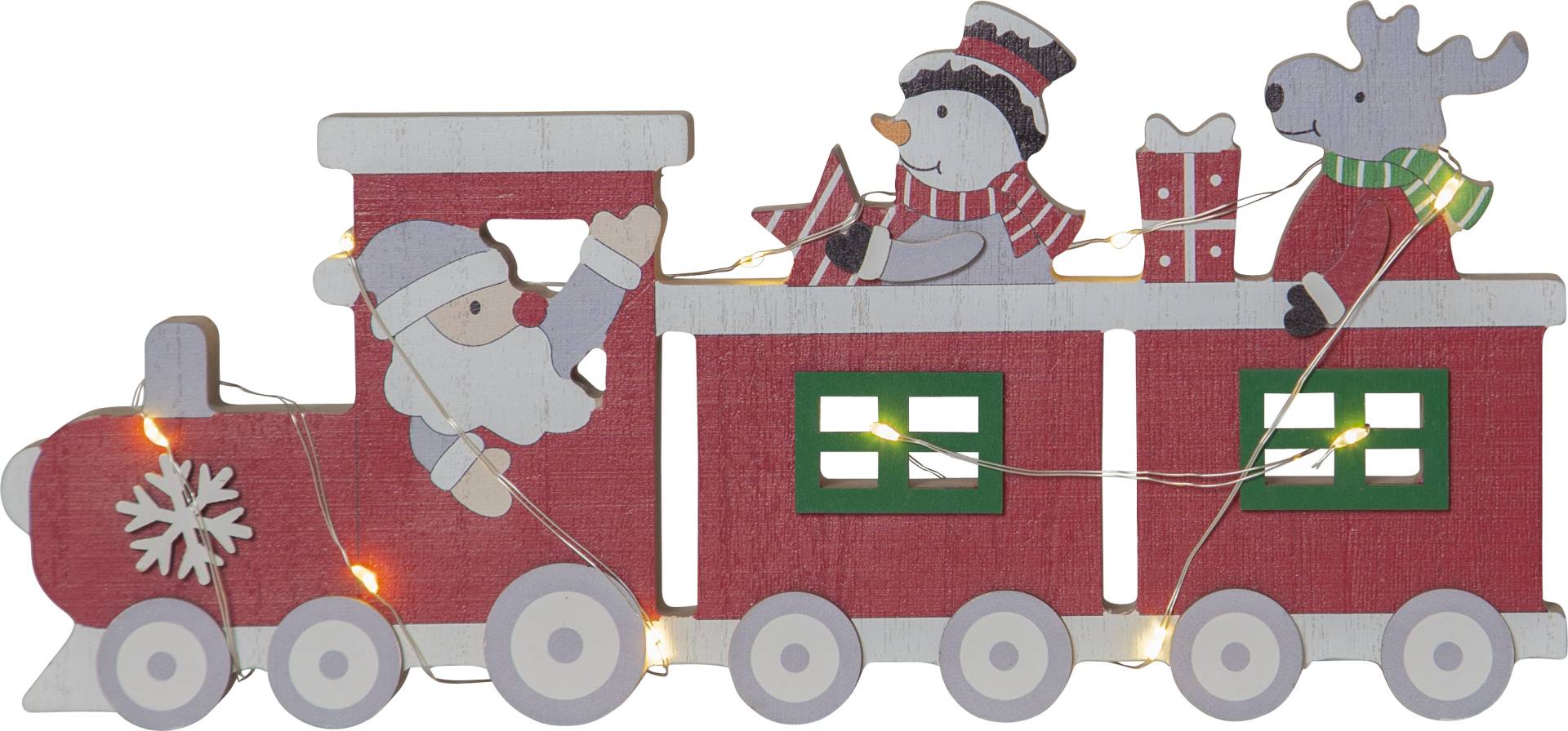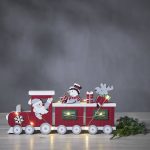 Puinen jouluaiheinen pöytäkoriste sisäkäyttöön. Koristetta valaisevat pienet LED-lamput lämpimän valkoisella valolla.