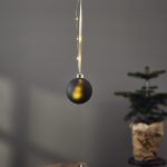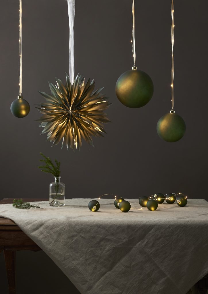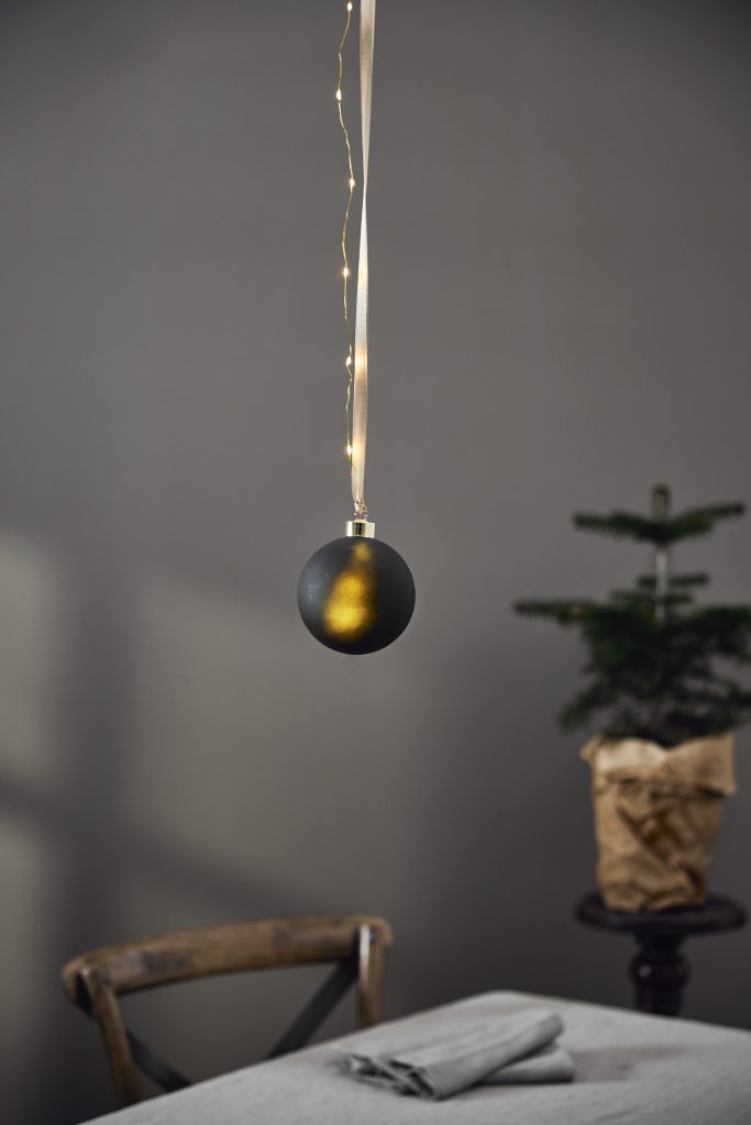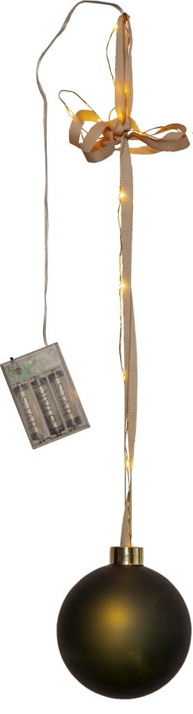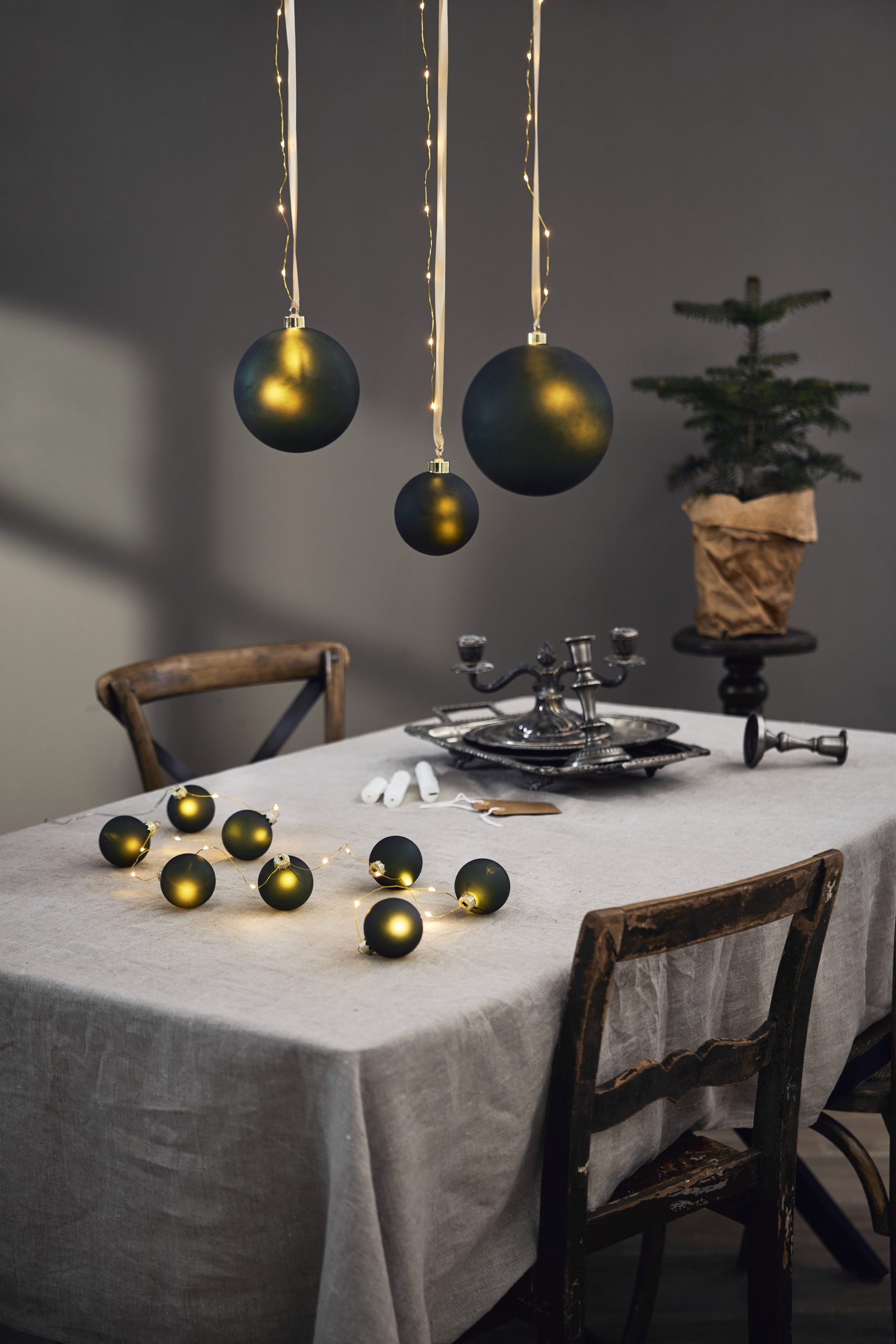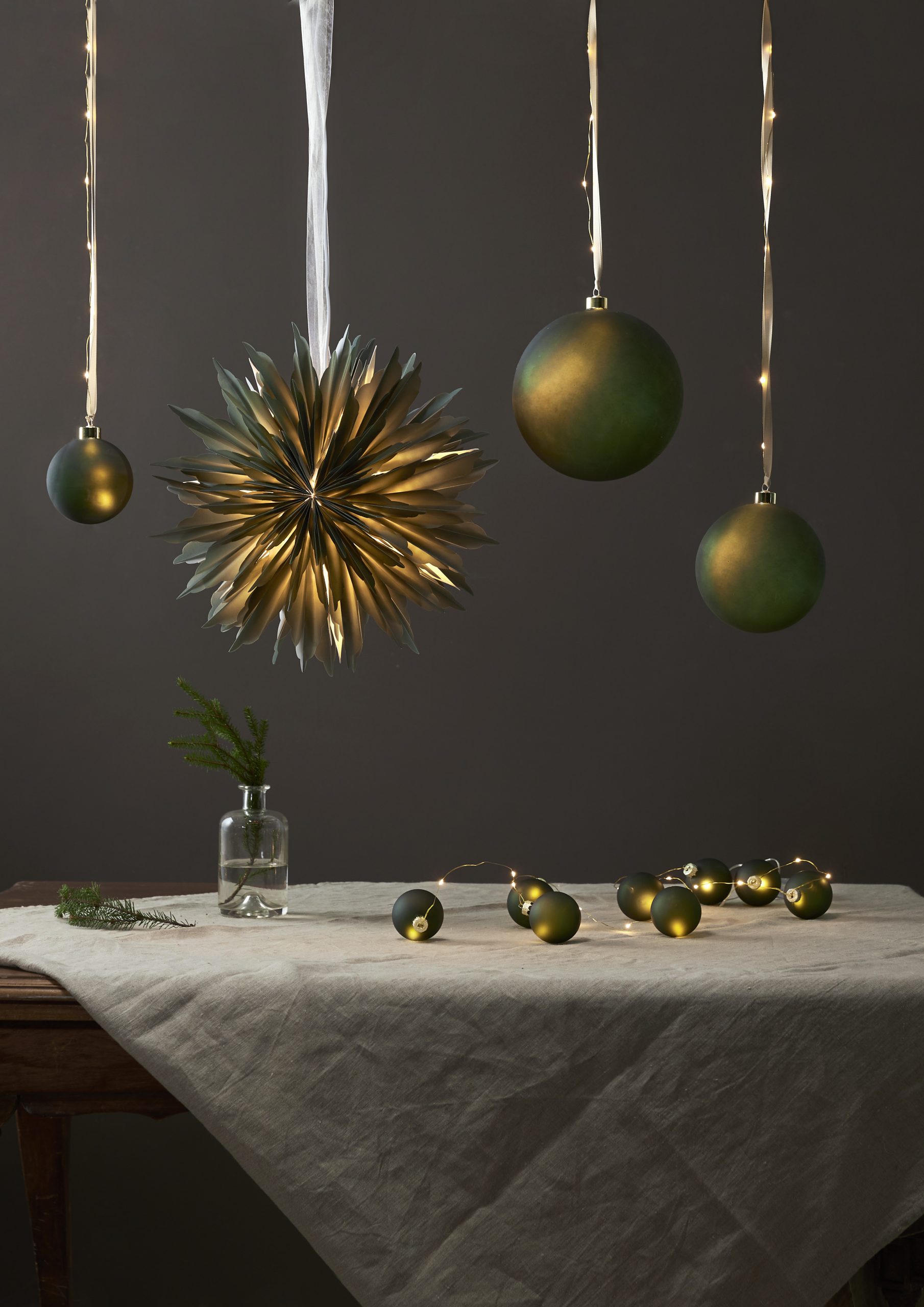 Mattapintainen vihreä lasipallo, jossa 13 Dew Drop LED-valoa kulkee ripustusnauhaa pitkin ja 3 valoa on lasipallon sisällä.