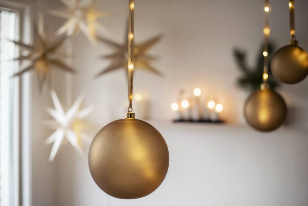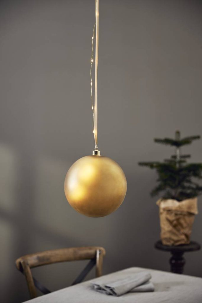 Mattapintainen kullanvärinen lasipallo, jossa 13 lämpimän valkoista Dew Drop LED-valopistettä kulkee ripustusnauhaa pitkin ja 7 valoa on lasipallon sisällä. Tämä paristokäyttöinen koriste sopii sisäkäyttöön esimerkiksi ikkunaan tuomaan lämmintä, tunnelmallista valoa joulunaikaan.