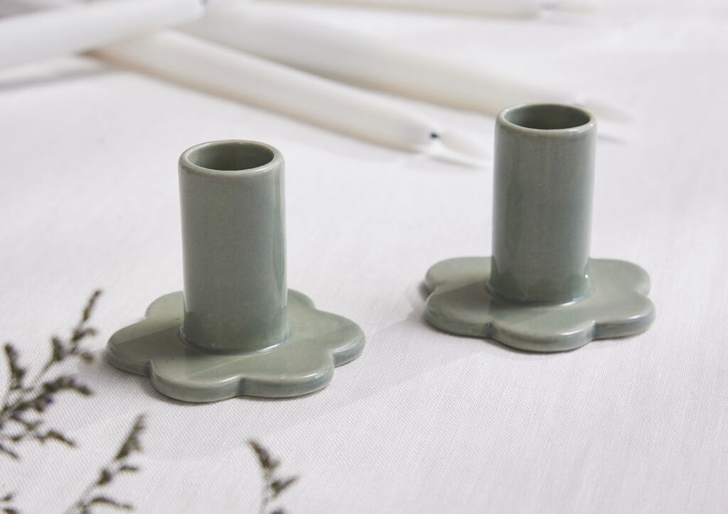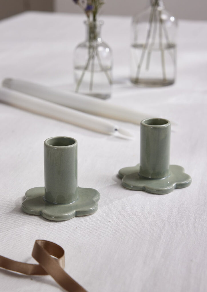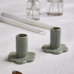 Bloom on posliinista valmistettu vaaleanvihreä kynttilänjalka, joka sopii käytettäväksi sekä aitojen steariinikynttilöiden että LED-antiikkikynttilöiden kanssa. Kynttilänjalan sisähalkaisija on noin 23 mm. Pakkaus sisältää kaksi kynttilänjalkaa.