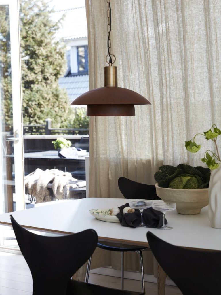 Bolton-riippuvalaisimessa on kaksi varjostinta, jotka kohdistavat valoa alaspäin. Käsintehdyissä varjostimissa on rustiikkinen ruosteen sävy ja valaisimen yksityiskohdat ovat antiikkimessingin väriset.