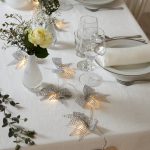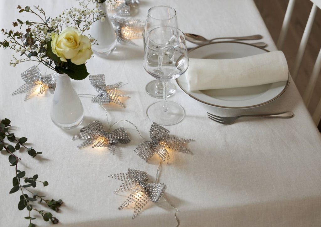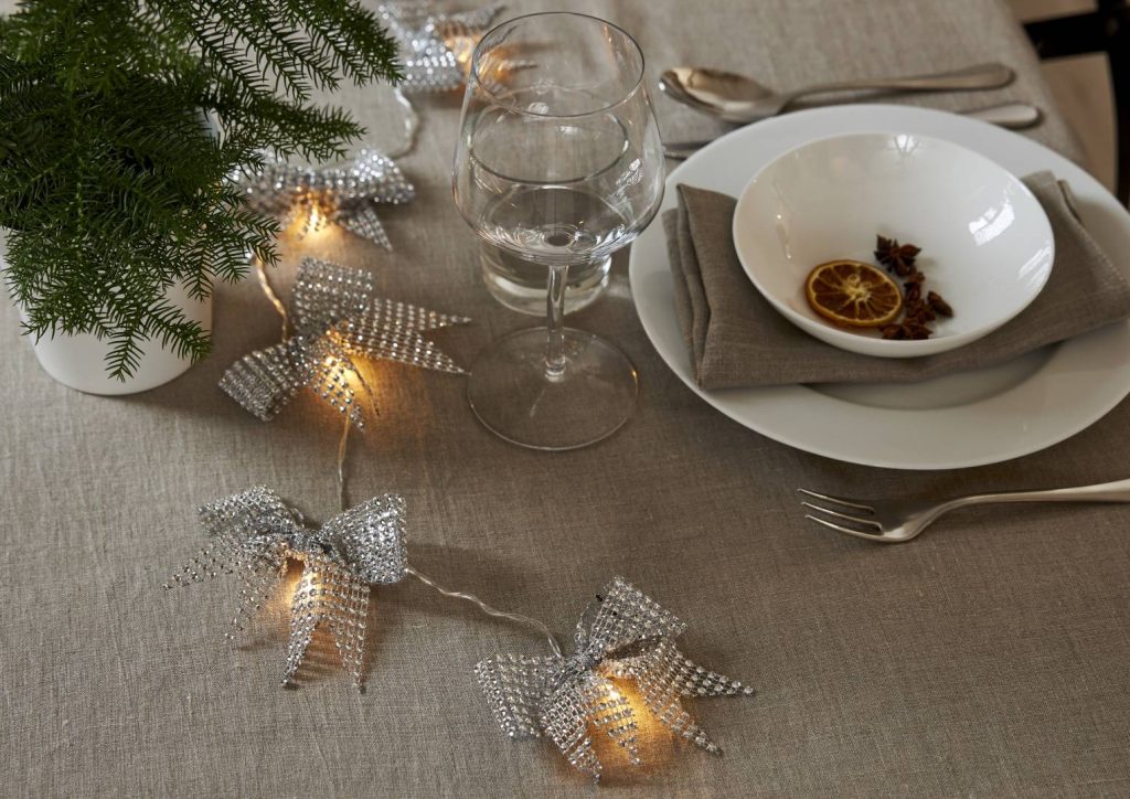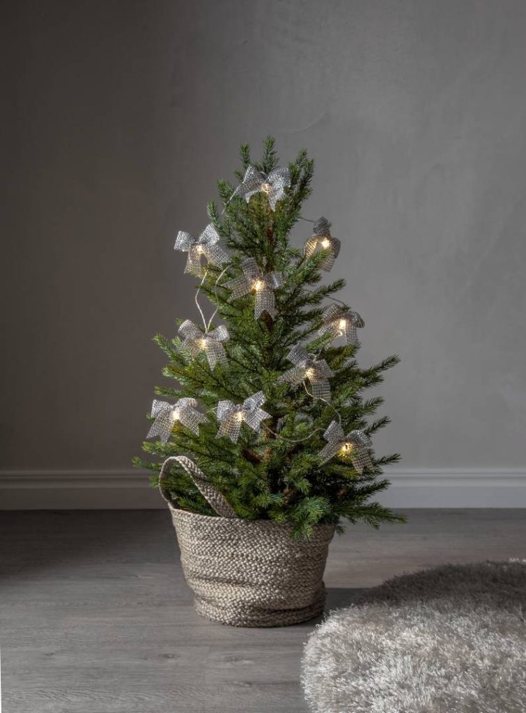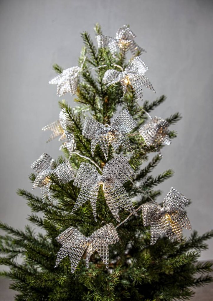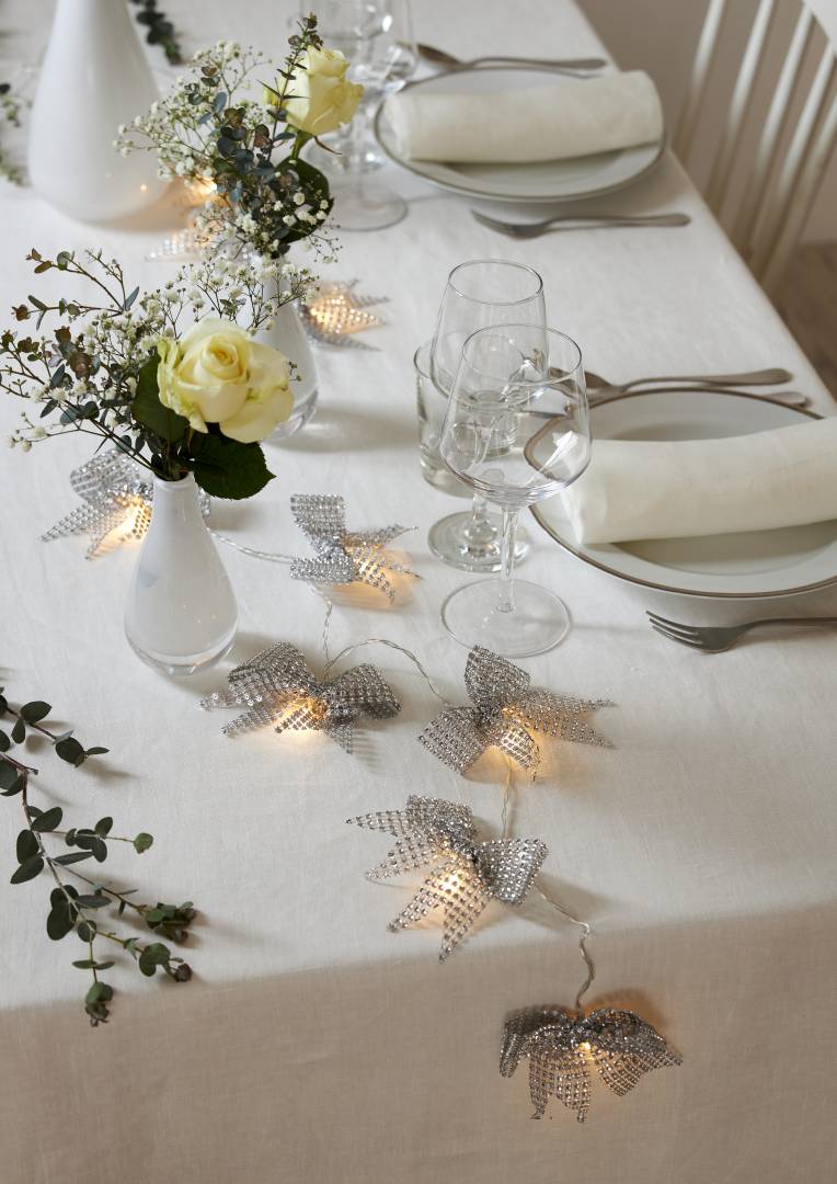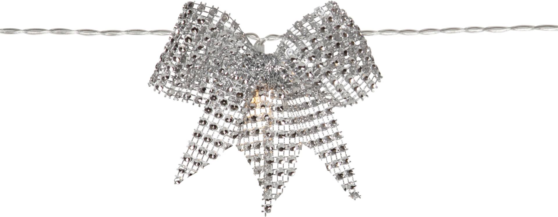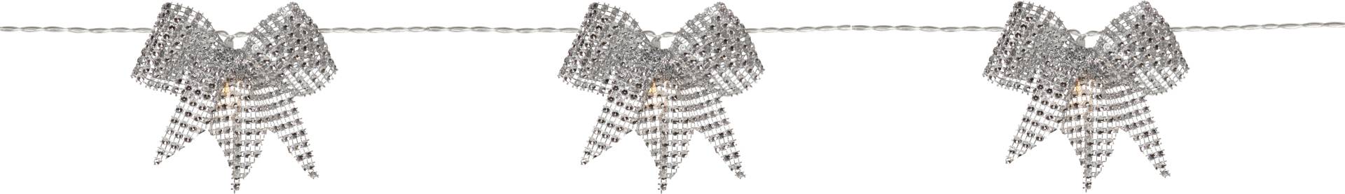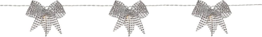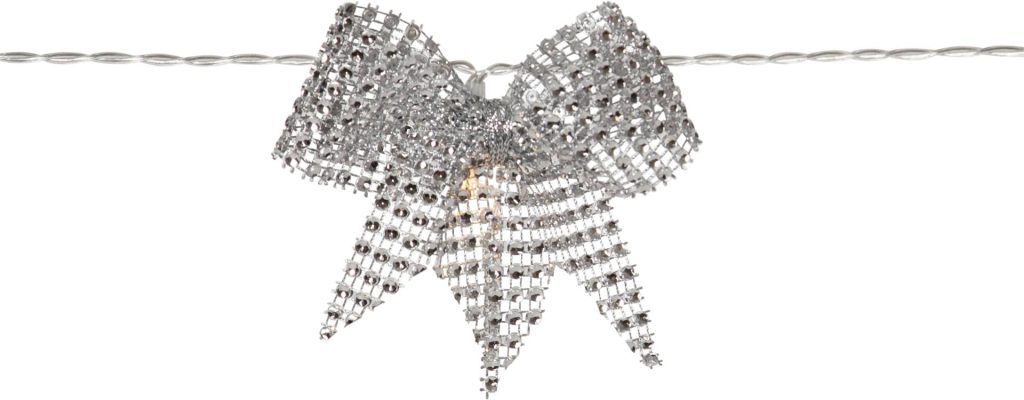 225 cm pitkä valosarja, jossa 10 hopean väristä rusettia lämpimän valkoisilla LED-valoilla. Sopii esimerkiksi kattausten koristeeksi tai joulukuuseen. Sisäkäyttöön.