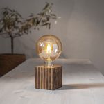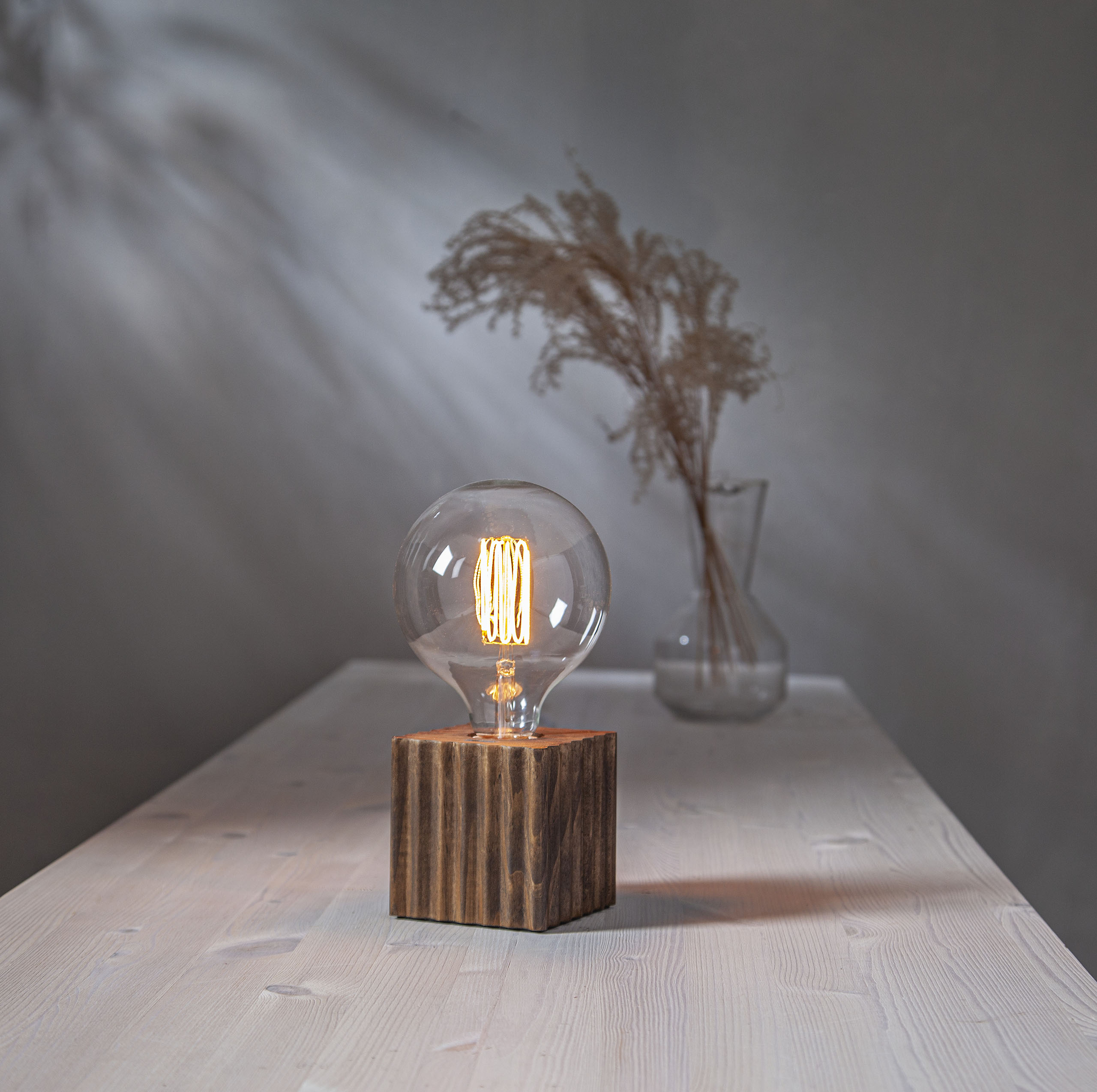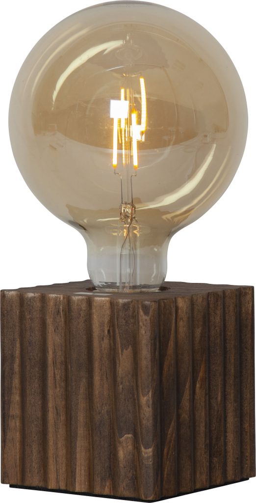 Pähkinän sävyiseksi petsattu puinen pöytävalaisin uurretulla kuvioinnilla ja E27-lamppukannalla. Saat elegantin valaisimen, kun yhdistät tähän lampunjalkaan kivan näköisen valonlähteen. Sopii esimerkiksi pöydälle tai ikkunalaudalle.