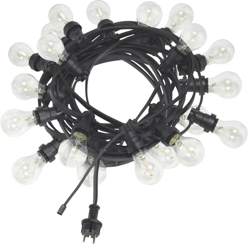 Tyylikäs ulko- ja sisäkäyttöön sopiva valosarja mustalla kumikaapelilla. Valosarja on 12,2 metriä pitkä.