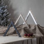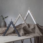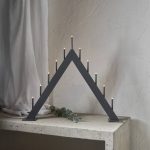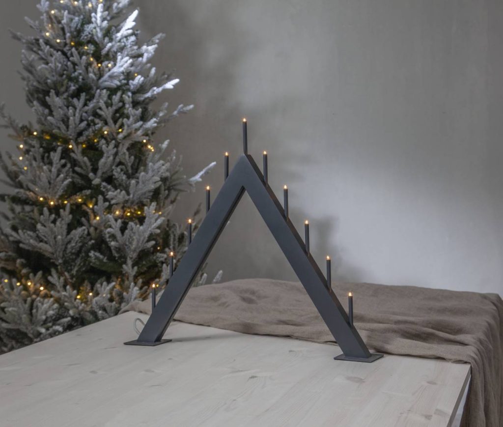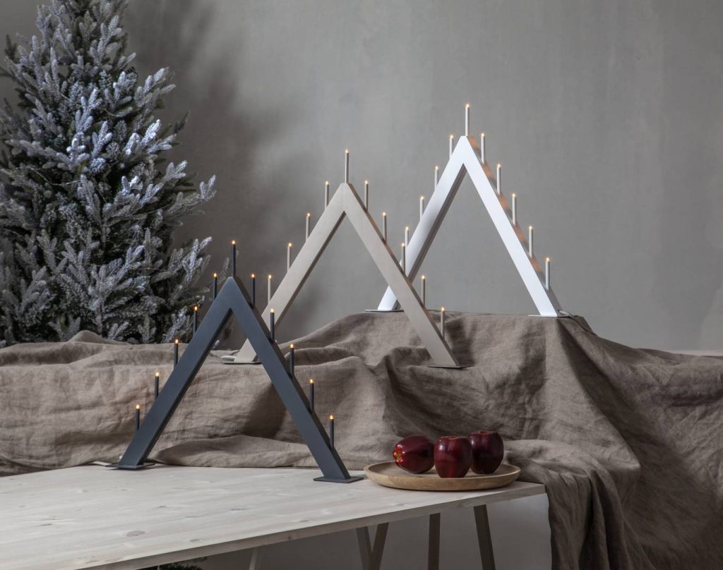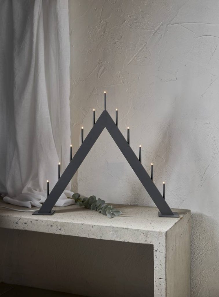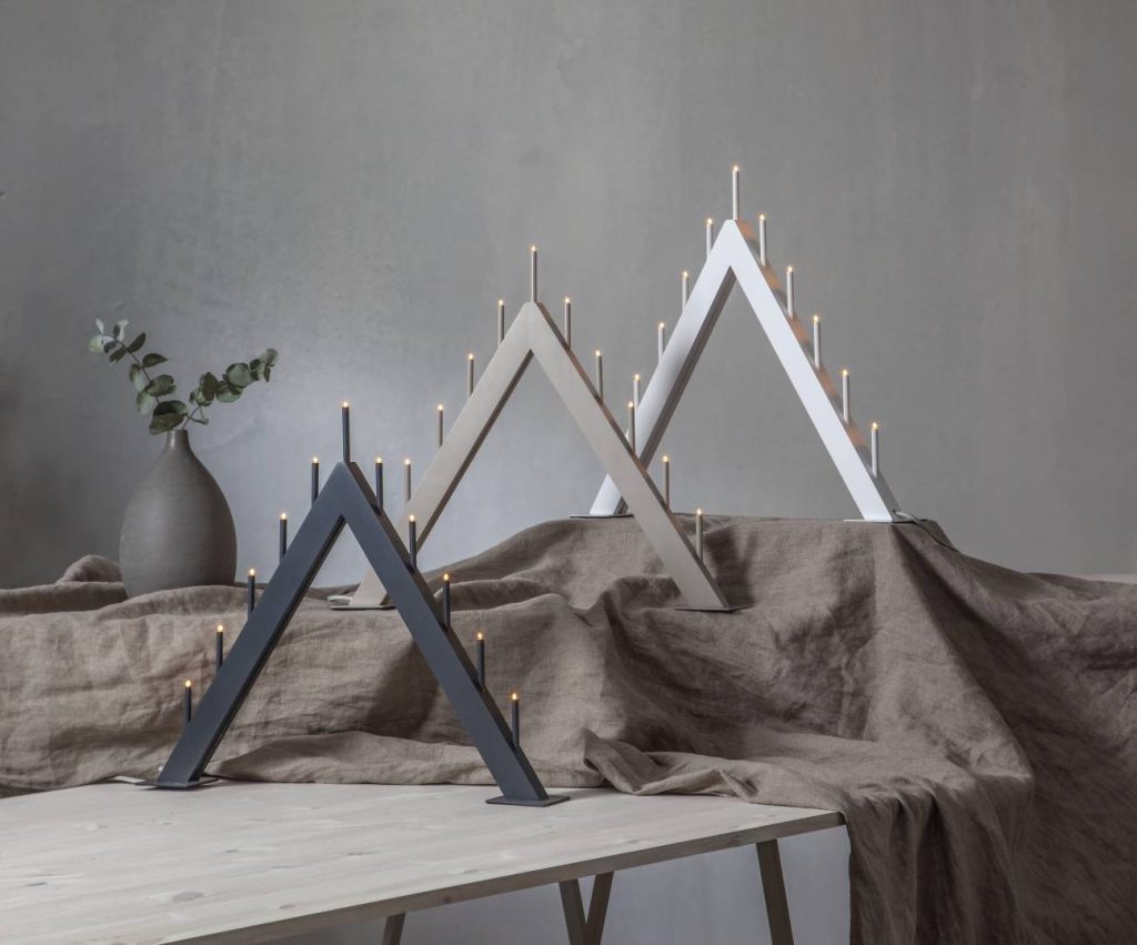 Tyylikäs A-mallinen kynttelikkö, jonka jalusta on puuta ja kynttilät metallia.