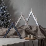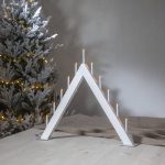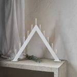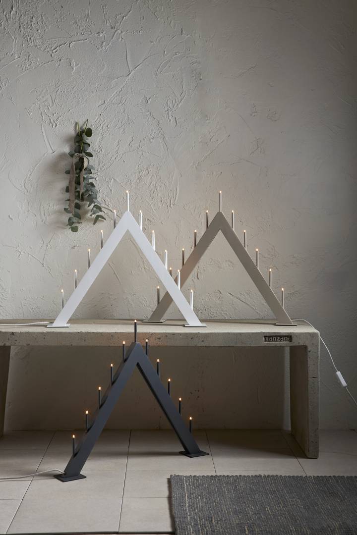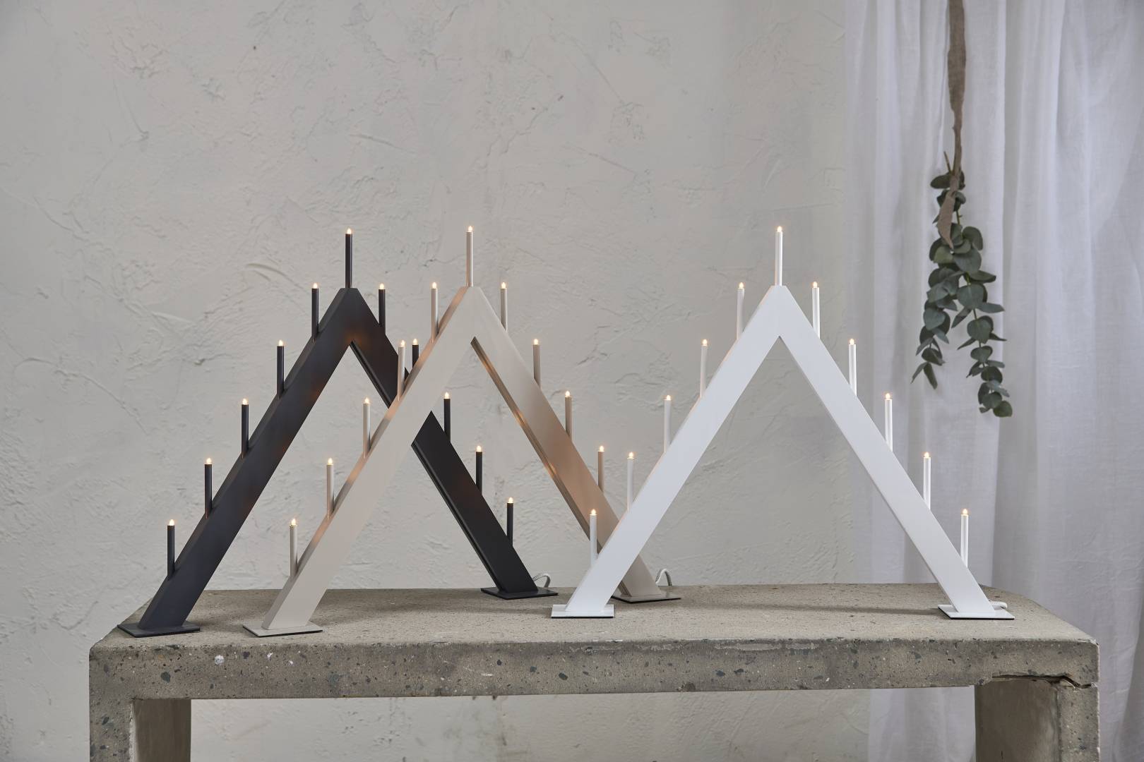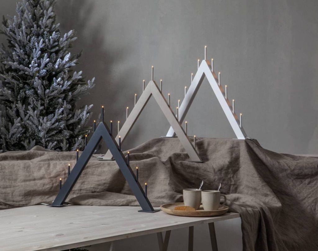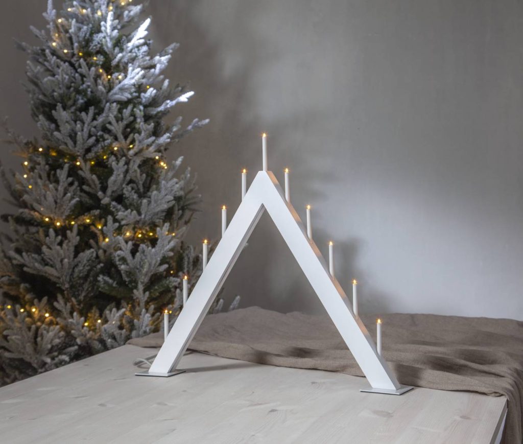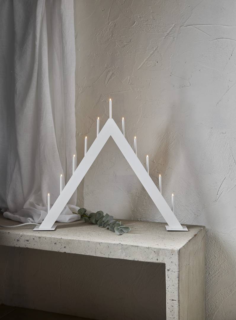 Tyylikäs A-mallinen kynttelikkö, jonka jalusta on puuta ja ohuet kynttilät metallia. Luo tunnelmallista valaistusta vaikka ympäri vuoden.