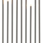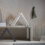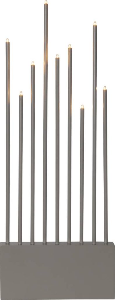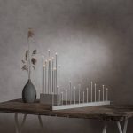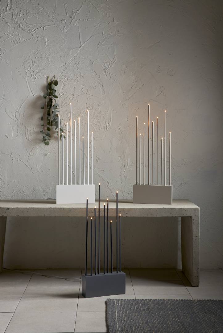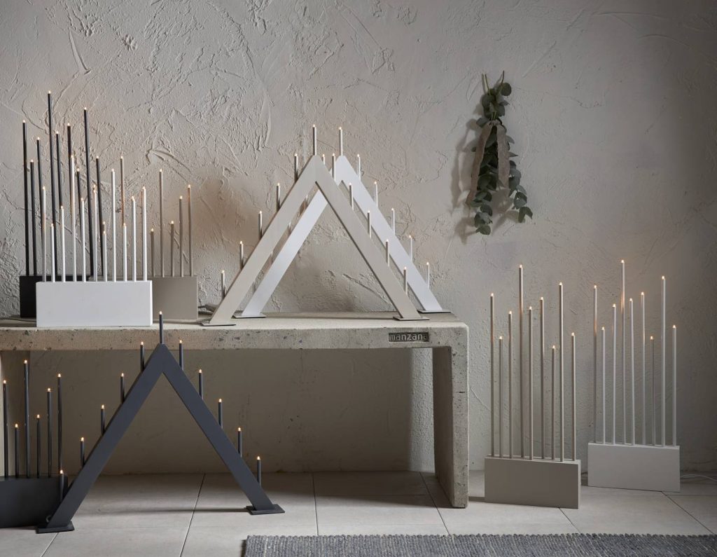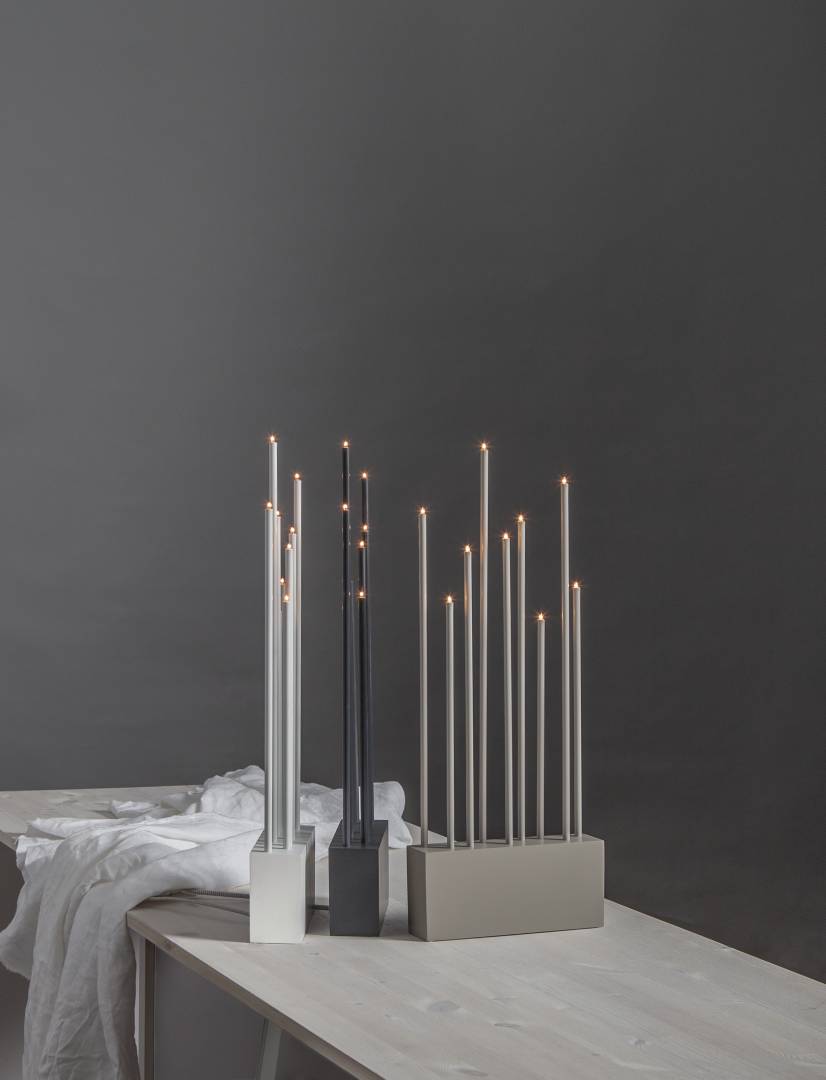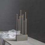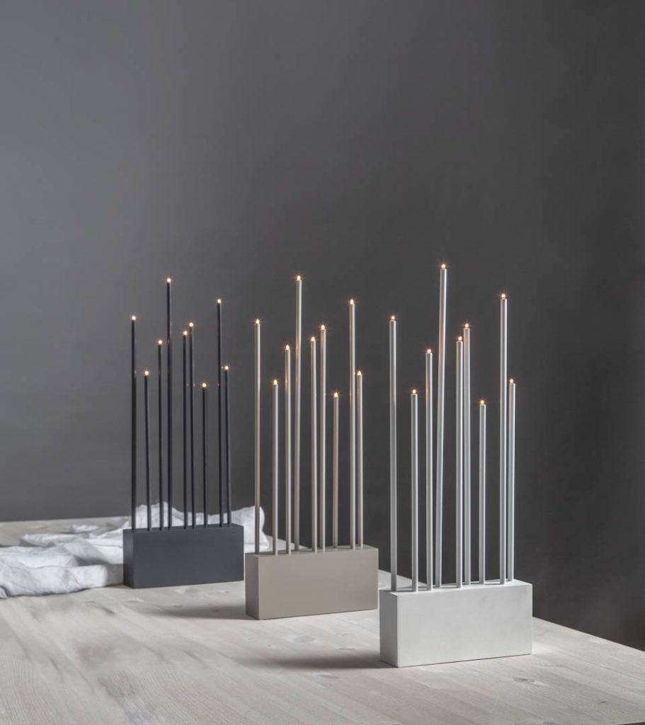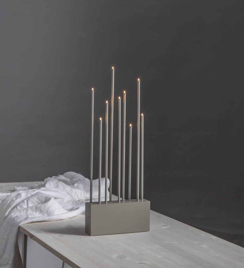 Tyylikäs kynttelikkö, jonka jalusta on puuta ja kynttilät metallia.
