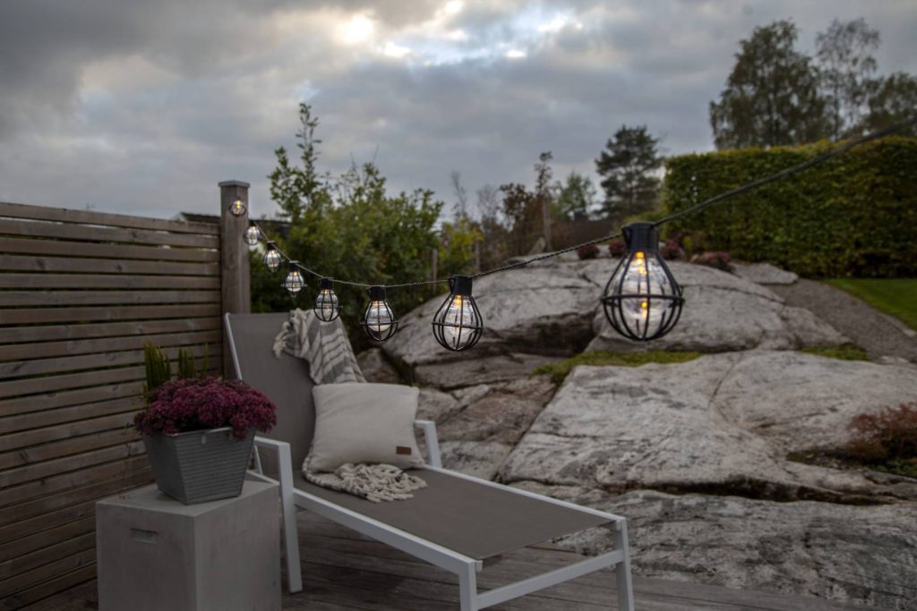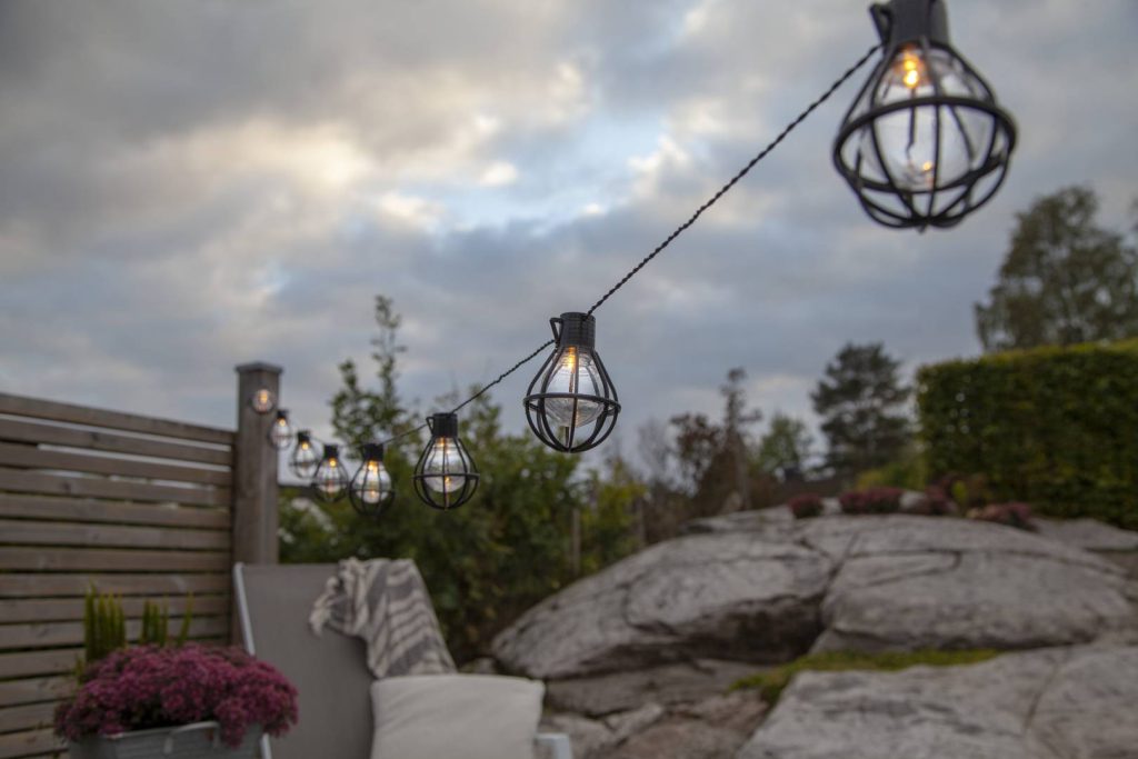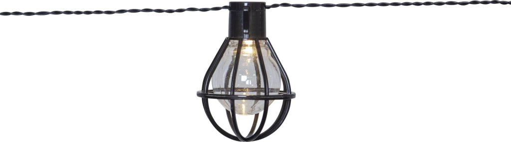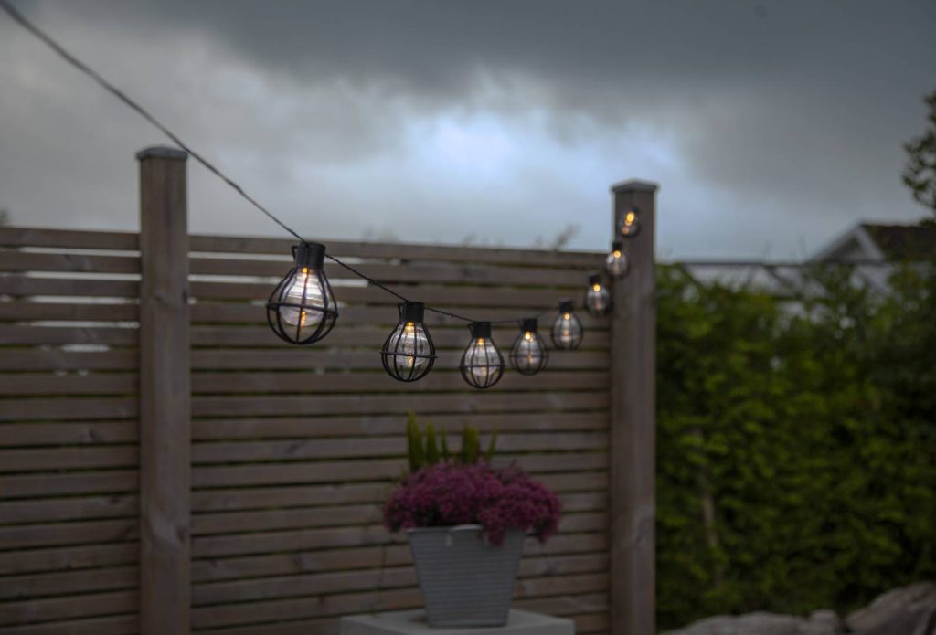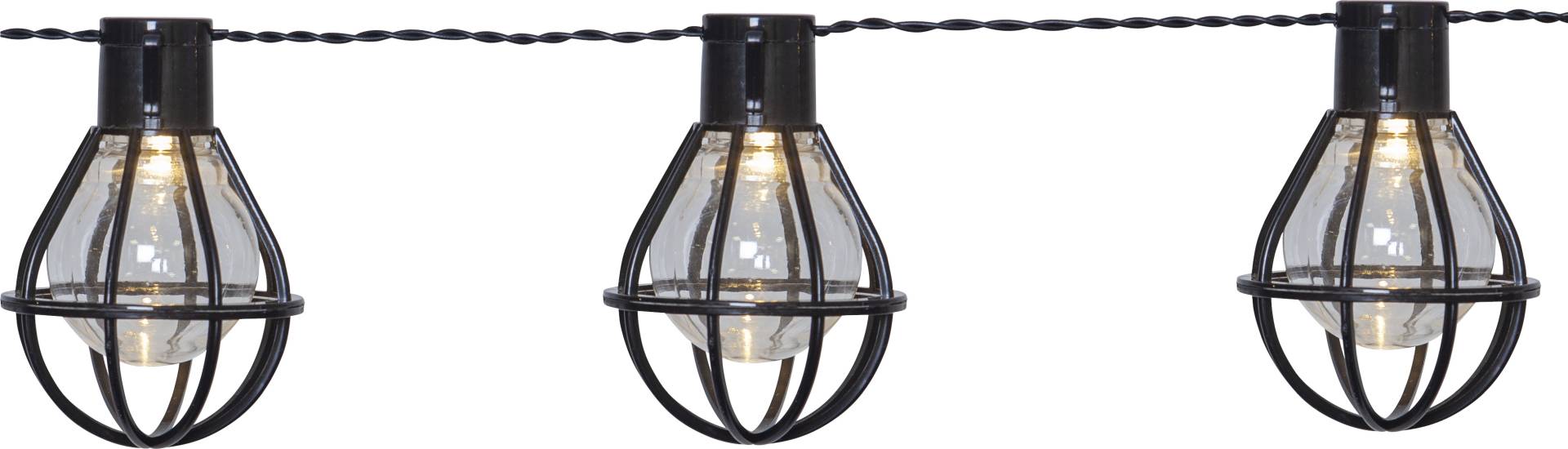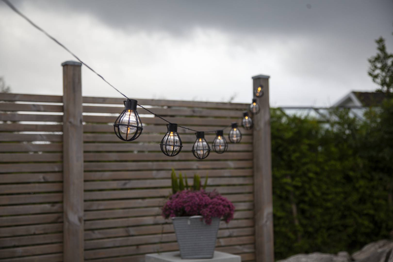 Ulkokäyttöön sopiva valosarja, joka sopii sekä arkeen että juhlaan, esimerkiksi puutarhaan tai terassille tuomaan tunnelmallista valoa. Valosarjassa on 8 kirkasta lamppua, joiden ympärillä on koristeena musta kori. Lamppujen sisällä loistaa lämpimän valkoinen LED-valo.