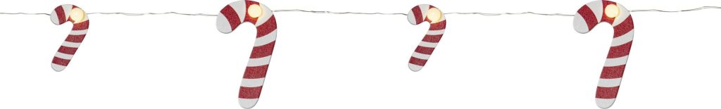 135 cm pitkä valosarja, jossa 10 punavalkoista karkkikeppiä lämpimän valkoisilla LED-valoilla. Sisäkäyttöön.