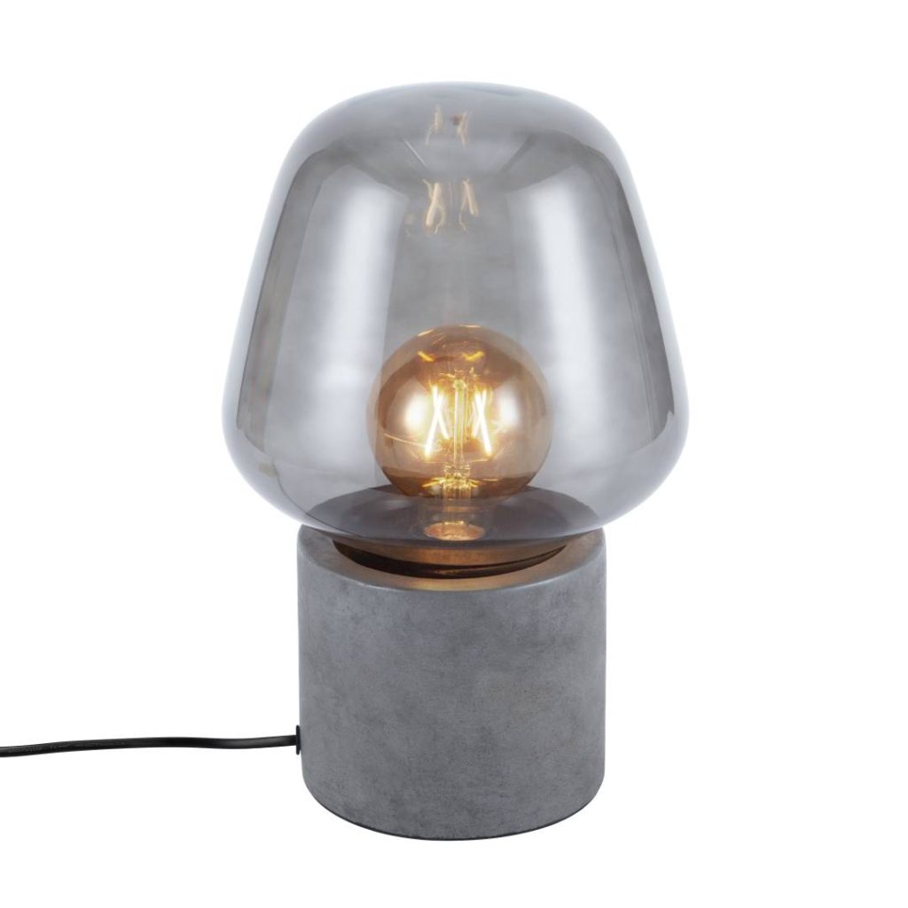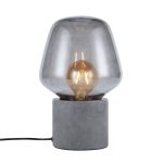 Pöytävalaisin savunharmaata lasia betonisella jalustalla. Jykevä jalusta toimii eleganttina kontrastina suurelle savunharmaalle lasikuvulle.