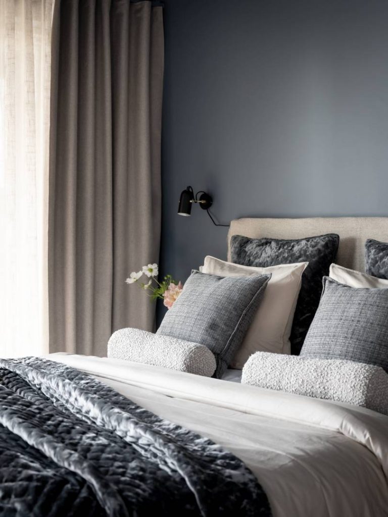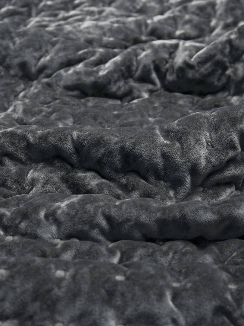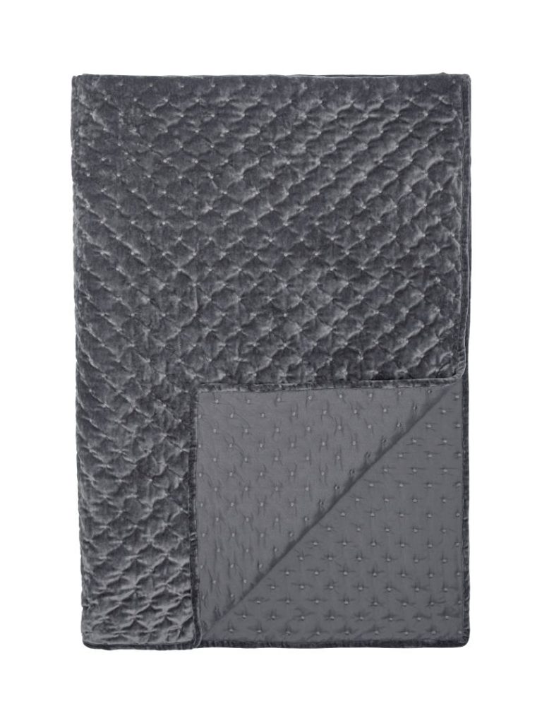 Samettinen tikattu päiväpeite brodeeratuilla pilkuilla.