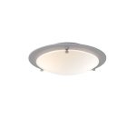 Pelkistetty kattoplafondi, jonka runko on metallia ja kupu opaalivalkoista lasia. Sopii moneen eri tilaan.