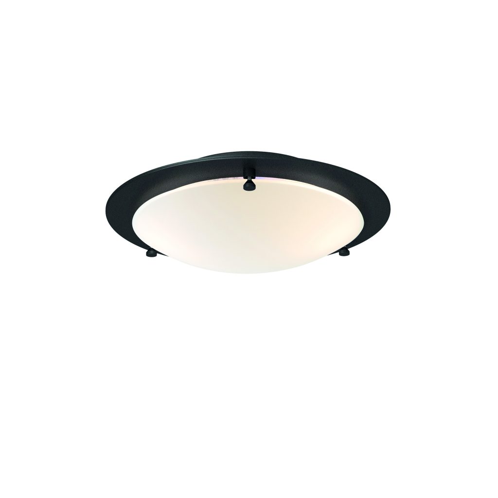 Pelkistetty kattoplafondi, jonka runko on metallia ja kupu opaalivalkoista lasia. Sopii moneen eri tilaan.