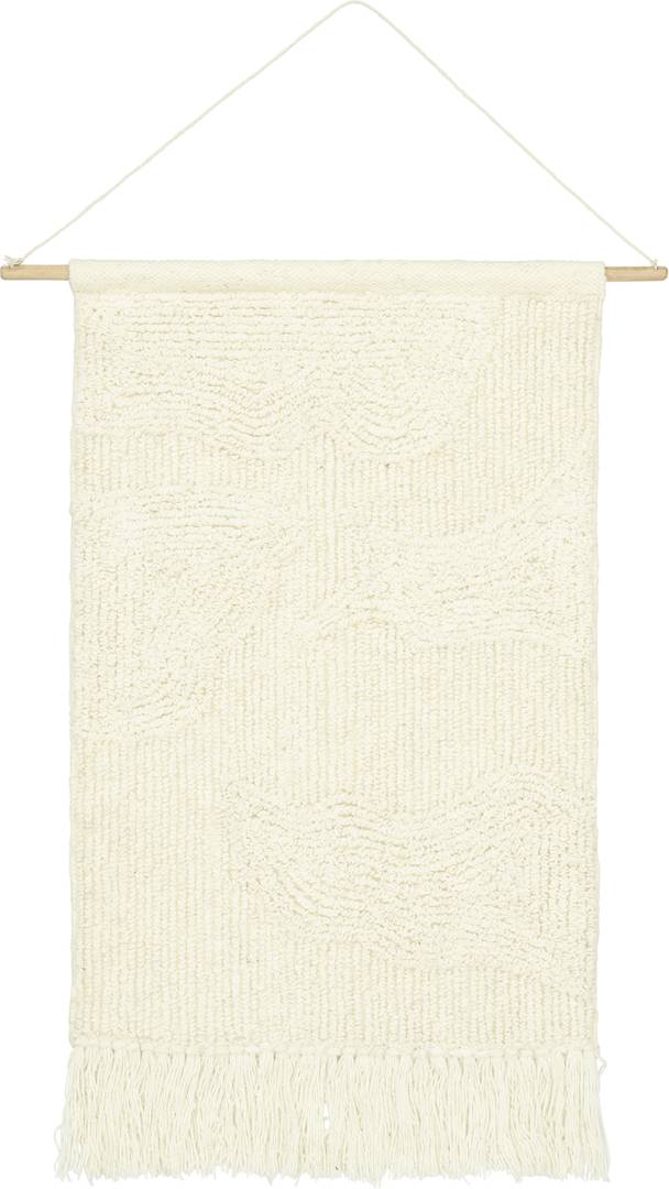 Käsin kudottu seinävaate villaa. Tuftatut kuviot. Pakkauksessa on mukana puulista ja nauha ripustamista varten.