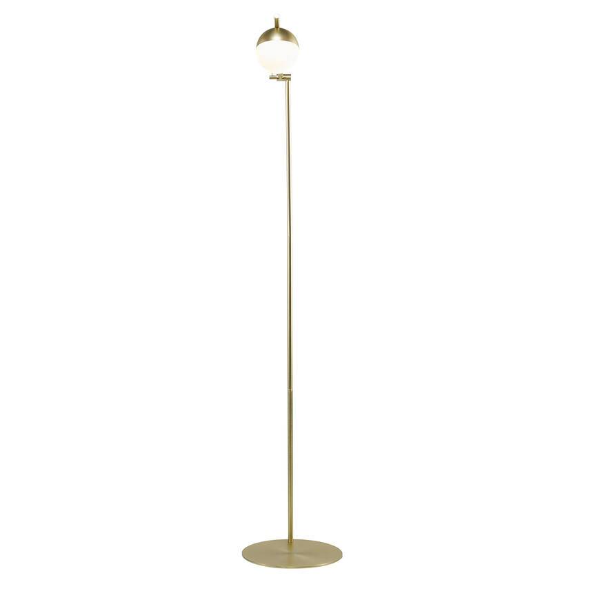 Messingin värinen lattiavalaisin metallia, kupu opaalivalkoista lasia.