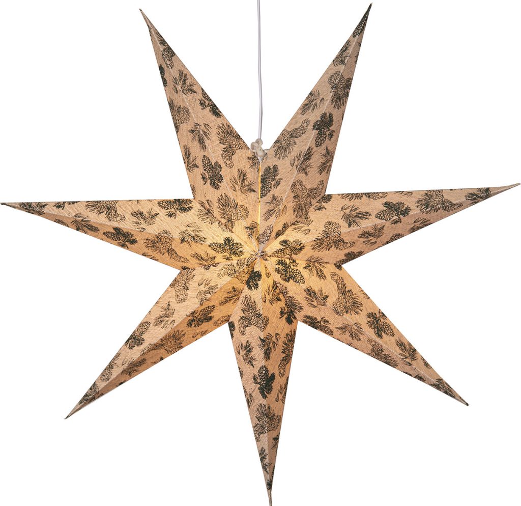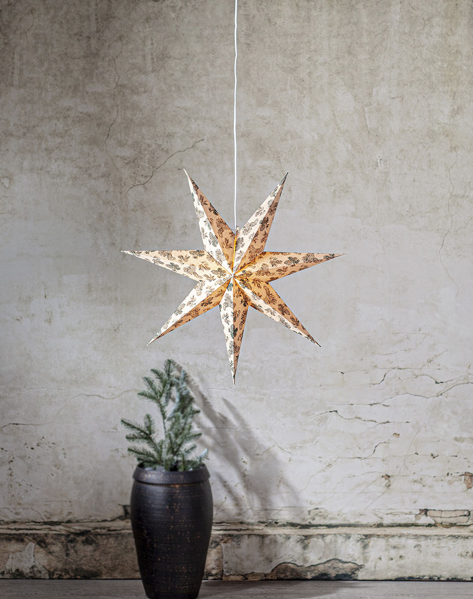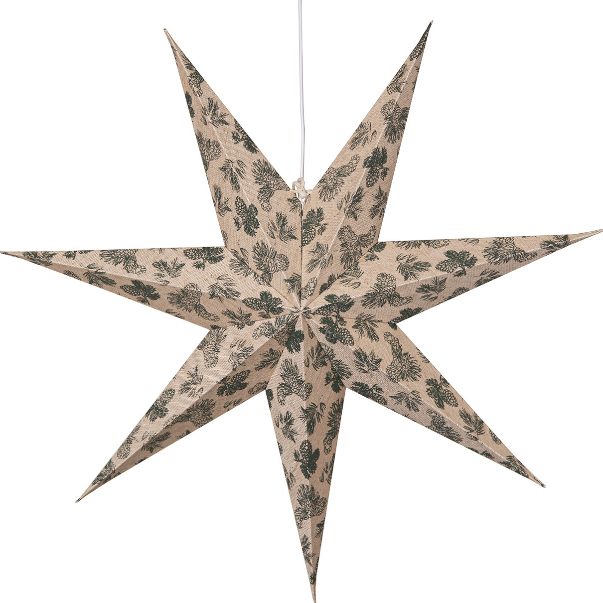 Klassinen beigen sävyinen paperitähti, jossa vihreä kuviointi, käpyjä ja havunoksia. Sopii ikkunaan tai seinälle tuo kotiin jouluista tunnelmaa. Tähdessä on käytetty FSC-merkittyä -paperia.