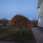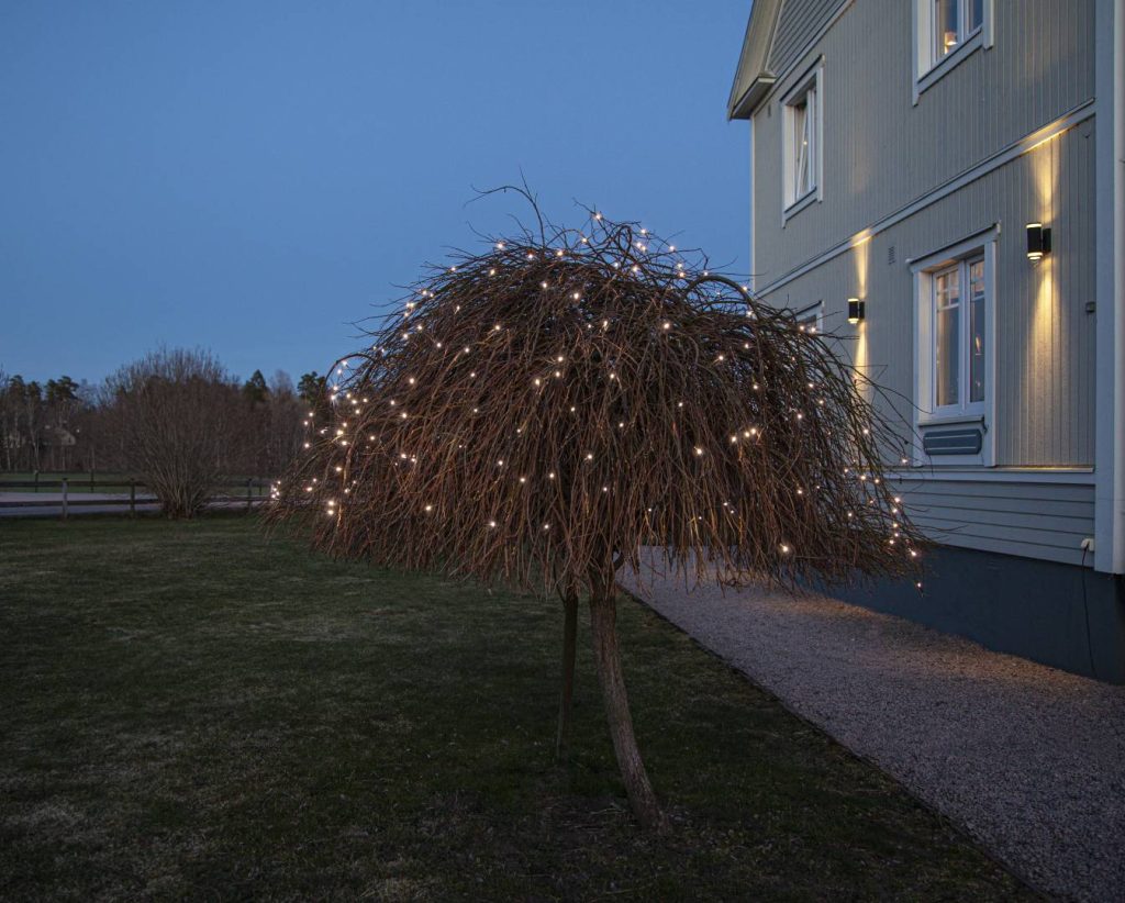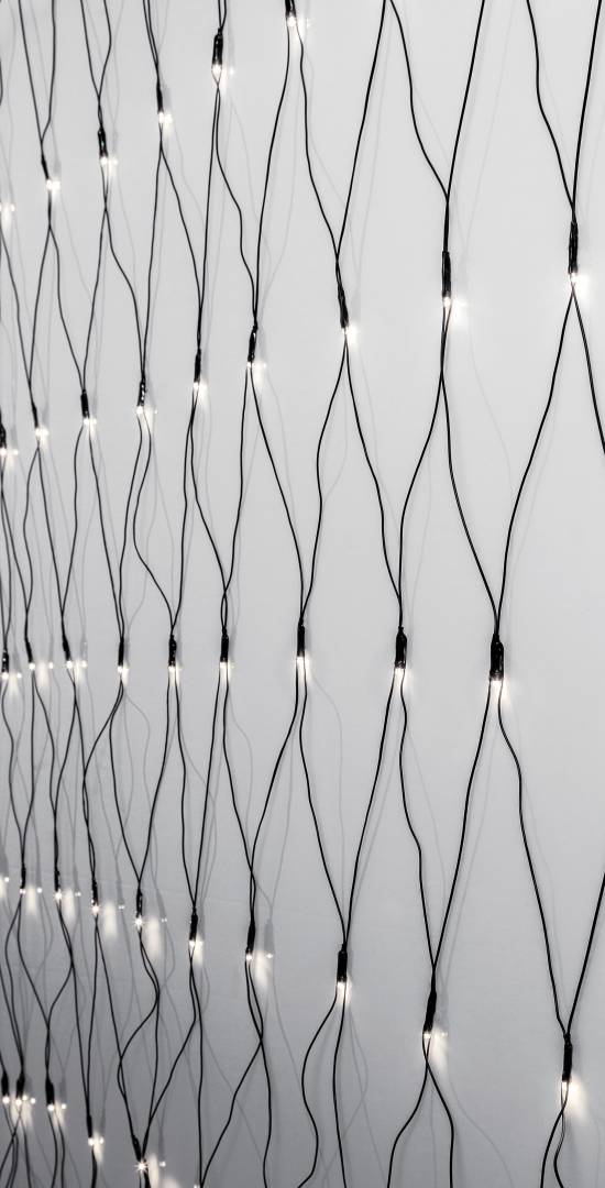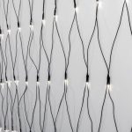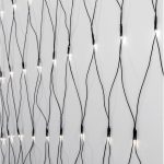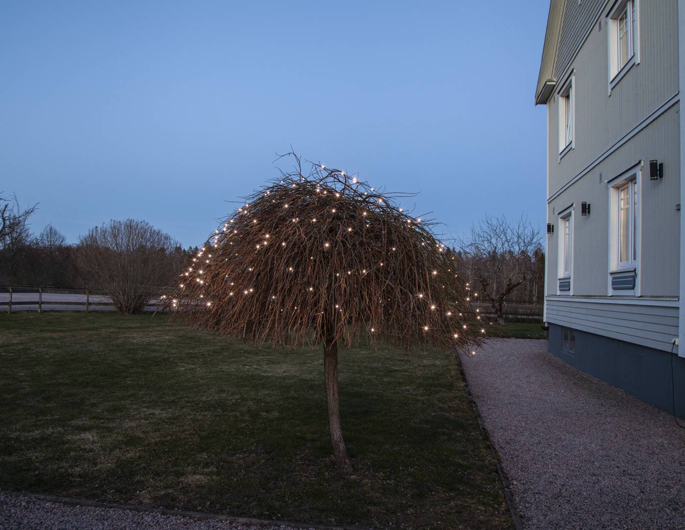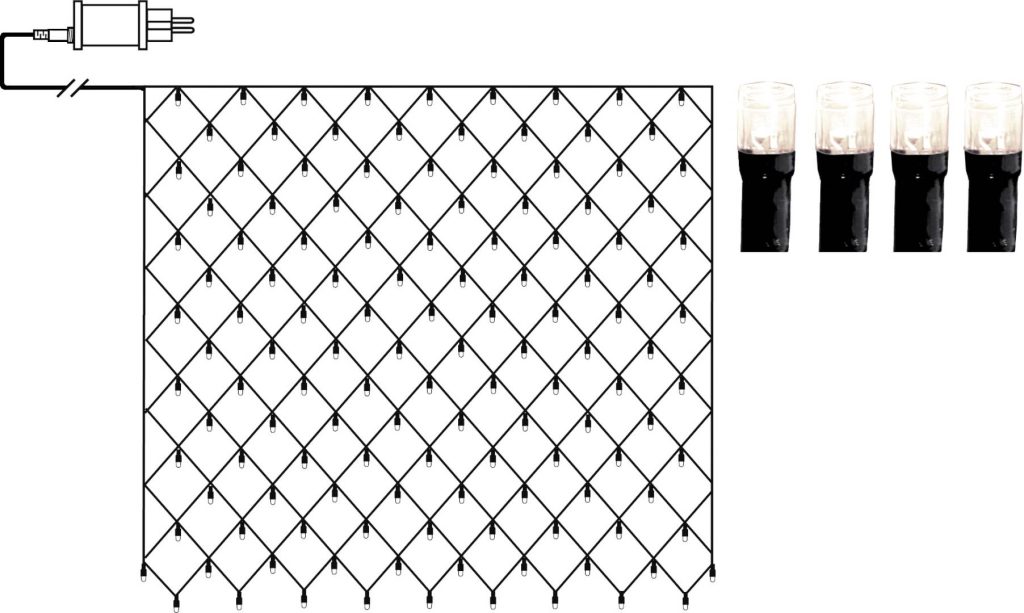 Ulkokäyttöön sopiva 3 metriä leveä ja 3 metriä korkea valoverkko, jossa on mustassa kaapelissa 200 valkoista LED-valoa. Sopii hyvin talviseen, lumiseen maisemaan.